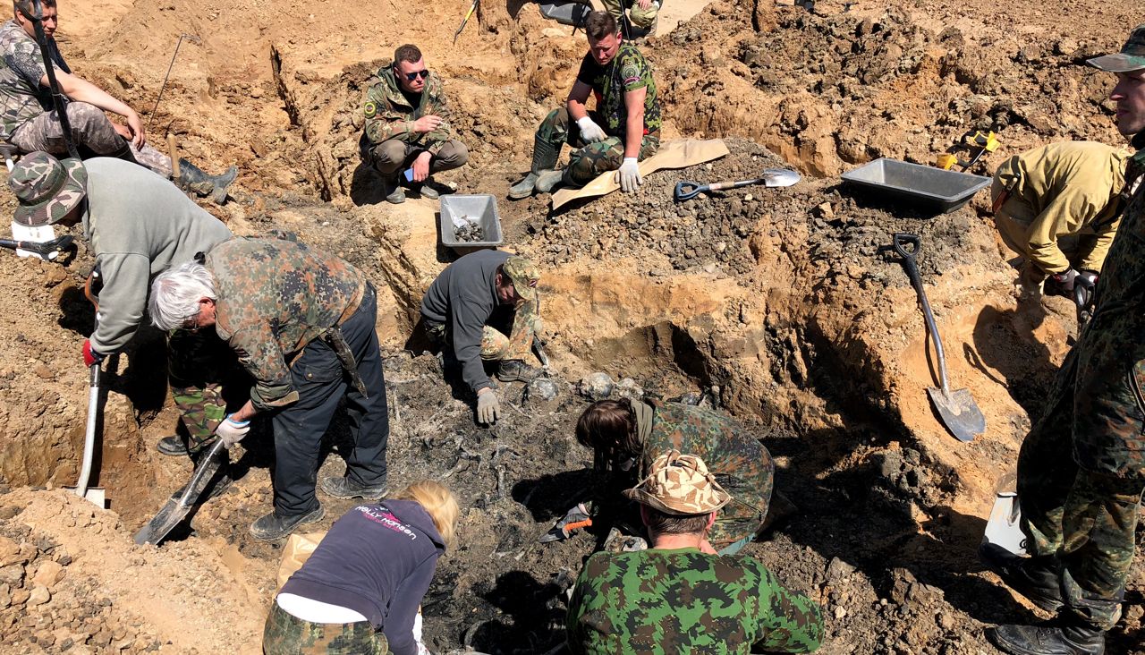 Экскаватор выкопал в середине дороги яму около полутора метров глубиной, туда спустились люди и начали работать маленькими совками и щетками. Через несколько минут стало ясно, что обнаружена братская могила как минимум восьми советских солдат. Одни поисковики аккуратно складывали черепа и кости в специальные пакеты, другие с помощью металлоискателей пытались найти любые личные вещи, которые помогли бы узнать имена и фамилии погибших.