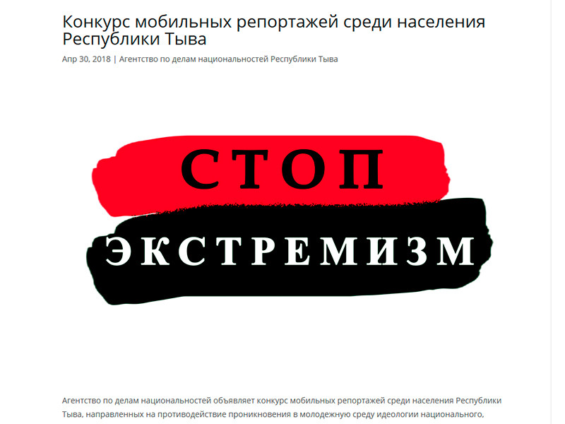С сайта Агентства по делам национальностей Тувы исчезла информация о конкурсе, в рамках которого жители республики в возрасте от 14 лет могли записать ролик со скриншотами, подтверждающими размещение в интернете экстремистских материалов и призывов к акциям протеста, и получить 3000 рублей.