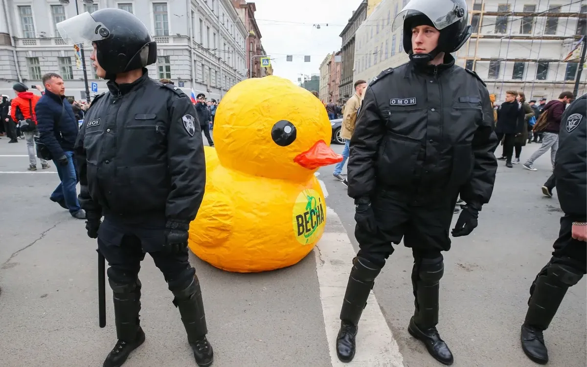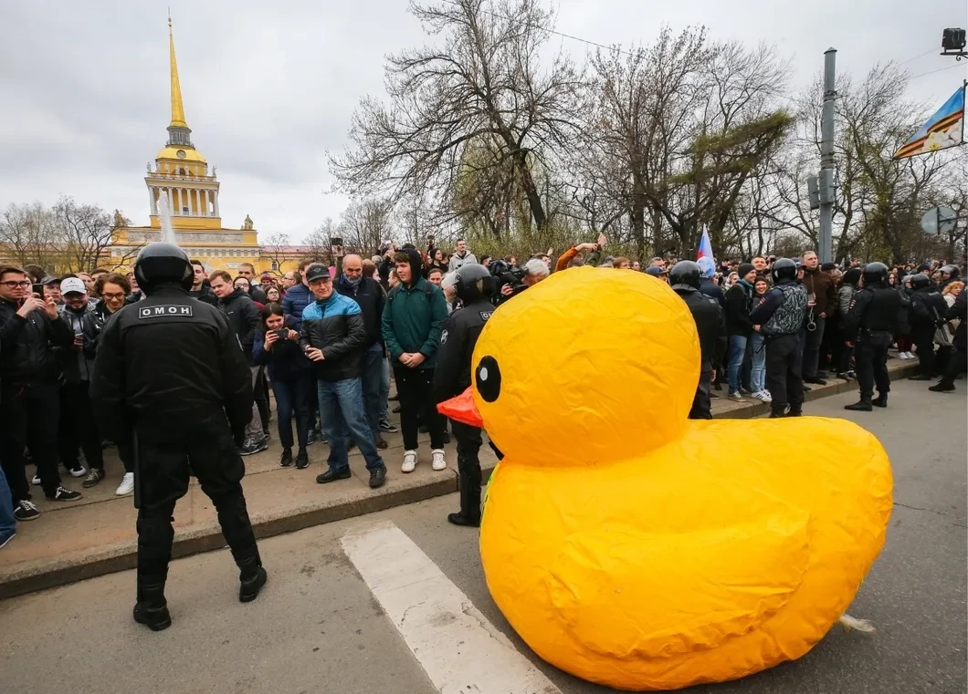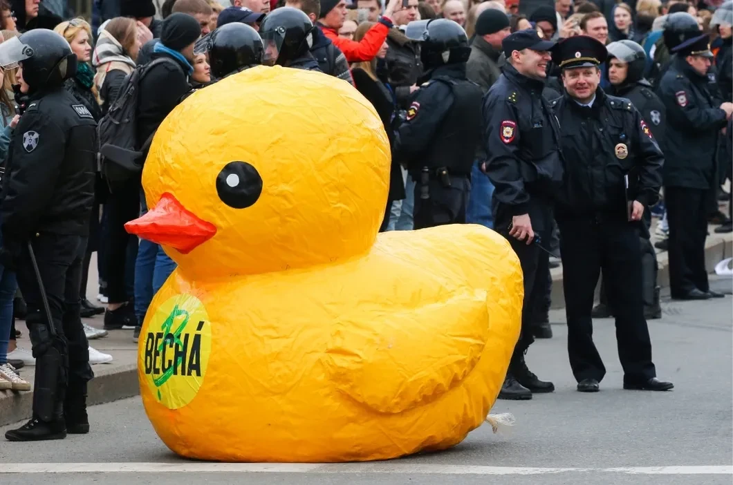 5 мая утка, плавающая в фонтане у Адмиралтейства, веселила всех. Когда полиция начала задерживать активистов в начале Невского, ребята из «Весны» бросились им на помощь, а утку оставили купаться. Полиция выудила утку из воды и «арестовала». Фотография надувной игрушки в окружении вооруженных дубинками полицейских обошла многие СМИ.