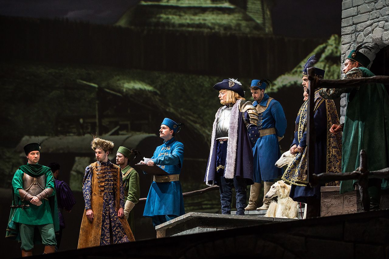 Начинается спектакль со сцены в борделе для поляков, которые все до одного ведут себя как похотливые свиньи. Единственными приличными людьми в армии ляхов оказываются немецкие наемники, которых играют волевыми, но все же продажными рыцарями — то ли дело русские витязи в белых сапожках. Все антироссийские и антигуманные речи со сцены произносит, разумеется, главный «фашист», польский король Сигизмунд. Валерий Бабятинский играет Сигизмунда эдаким капризным и недалеким, но в чем-то симпатичным королем из пьесы Шварца: то ударяется в карикатуру и комикование, то, раскрывая свои злобные замыслы, говорит зловещим шепотом, то печально и даже трогательно заявляет белой красавице-борзой (на сцене их зачем-то две), что она чуть ли не единственный его друг, а потом снова комично сникает к финалу, когда —огромный спойлер! — вместо желанного золота в сундуках под смоленской крепостной стеной находит пропавшие рукописи из библиотеки Ивана Грозного. «Вот оно, золото русских!» — восклицает посрамленный польский король. Самая читающая нация в партере, очевидно, должна от такого сюжетного поворота прийти в патриотический экстаз.