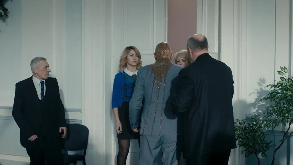 Жанр фильма абсурдистский хоррор, но попытка сотворить трагический бурлеск удается не всегда. Трагическая действительность стоит комом в горле театрализованной интерпретации. Поэтому несколько обособленно смотрится монструозная свадьба, пародирующая реальное бракосочетание «по-ДНРовски»: бойцов Куклы и БМВ. Градус крика и уродства зашкаливает, превращая эпизод в жутковатый фарс, которым дирижирует администратор ЗАГСа. Тетеньку из ЗАГСа играет актриса Киры Муратовой Наталья Бузько. Но здесь очевидны интонации не столько муратовского кино, сколько программы «Маски-шоу».
