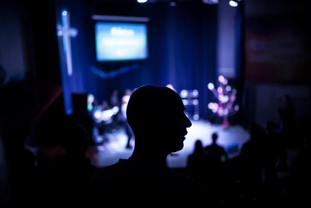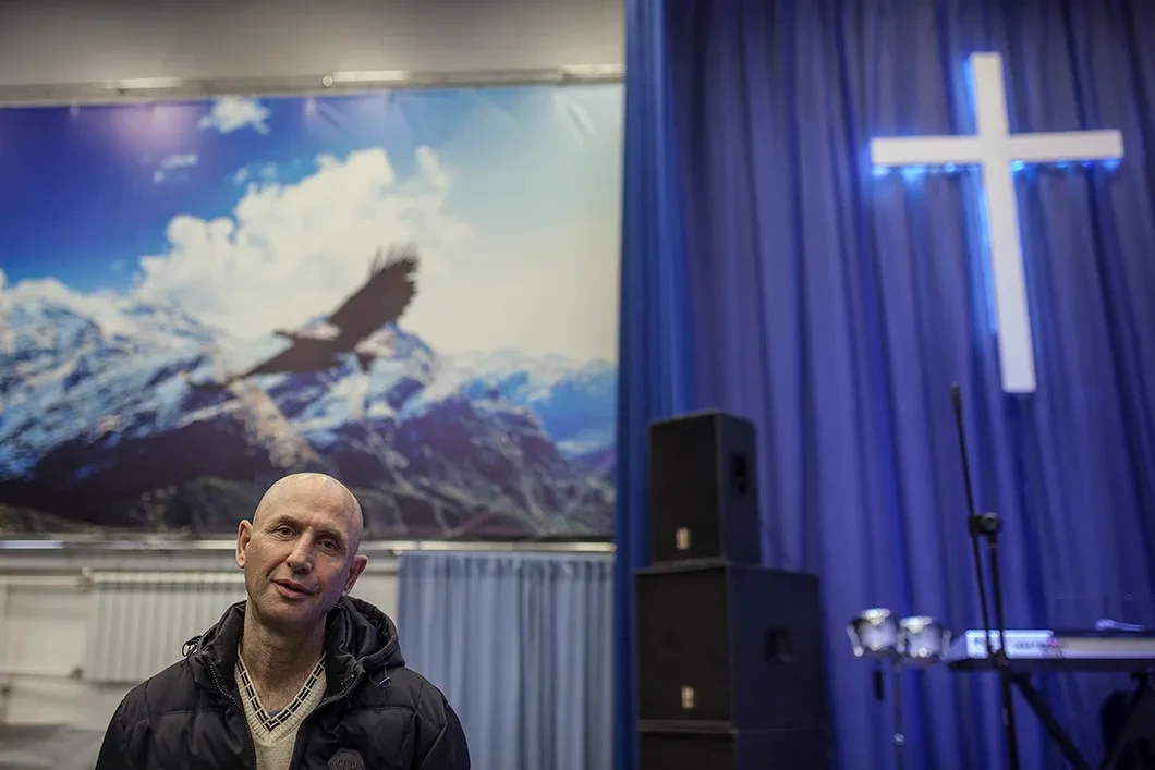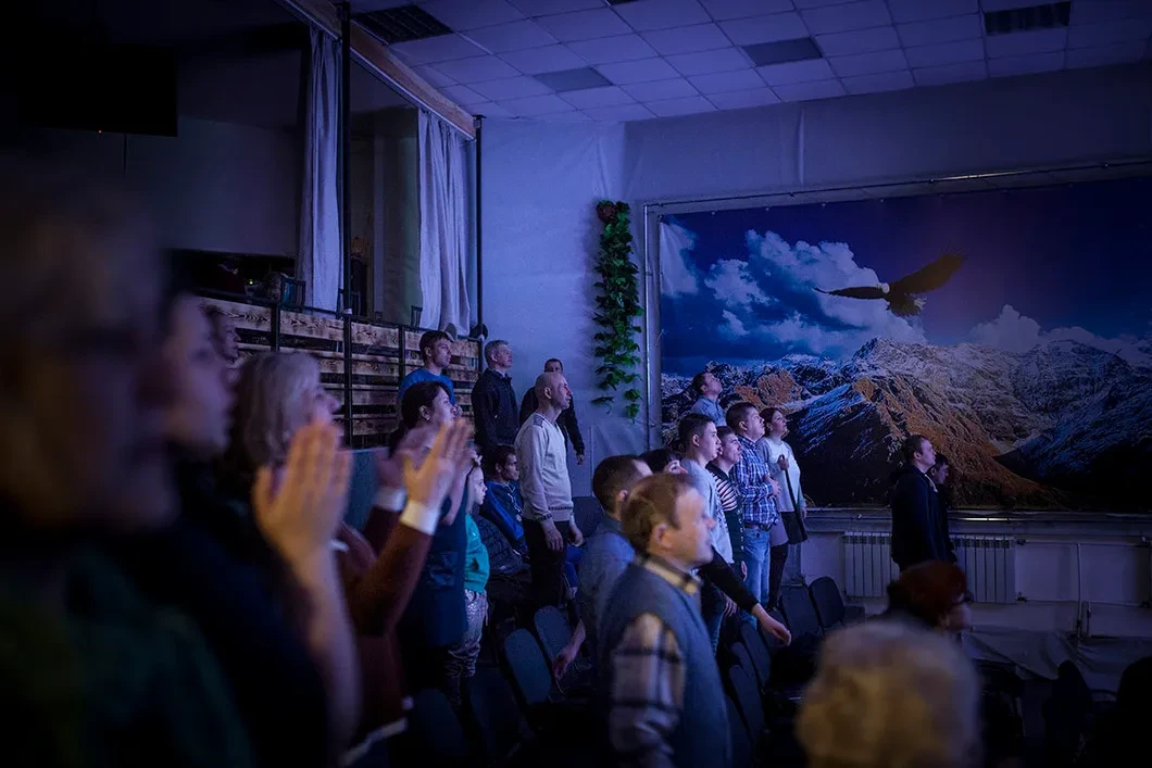 На предпоследнем ряду в синем свете софитов блестит лысина Андрея. Он посещает «Краеугольный камень» уже несколько лет. Он, как и многие другие воцерковившиеся, попал сюда из протестантского реабилитационного центра.