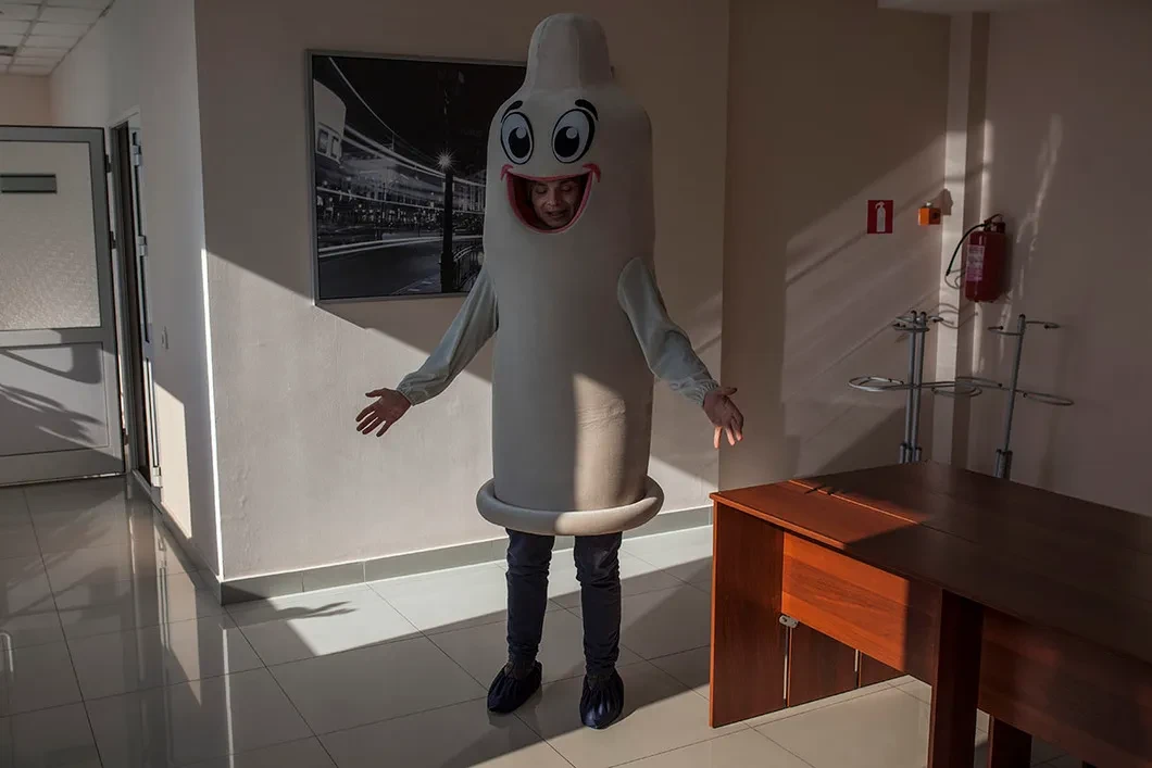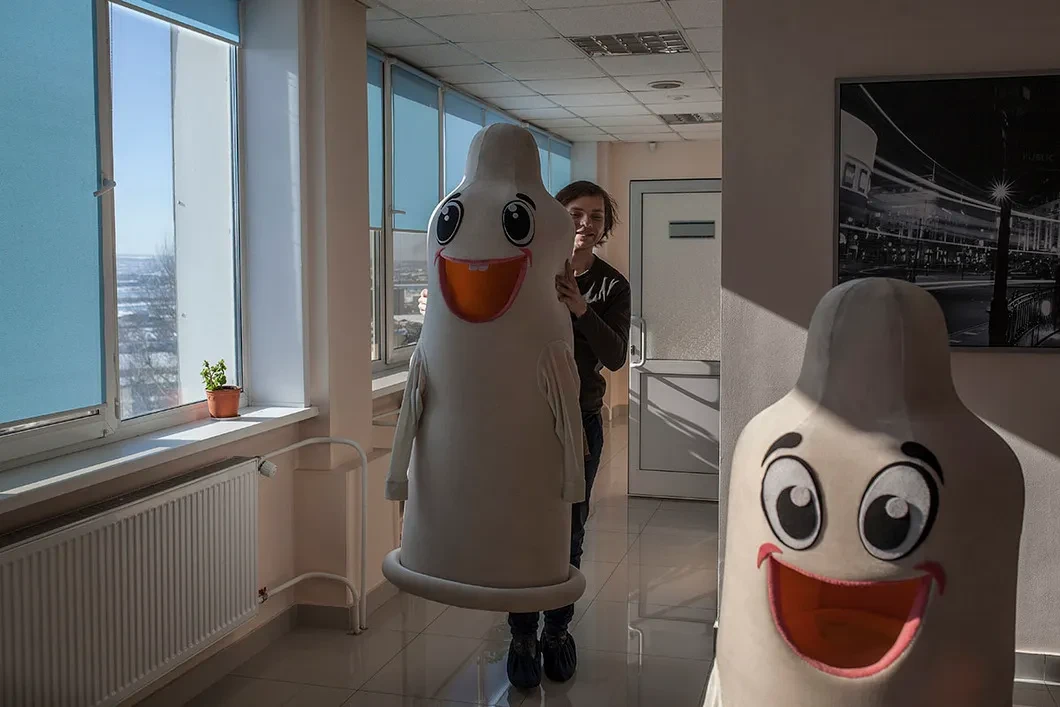 Костюмы заказали в фирме, которая шьет ростовые куклы. Изготовили их по эскизам костюма ракеты: первый за 32 тысячи рублей, второй обошелся в два раза дешевле. Ныряешь в презерватив — внутри мягко. Чувствуешь себя в безопасности.