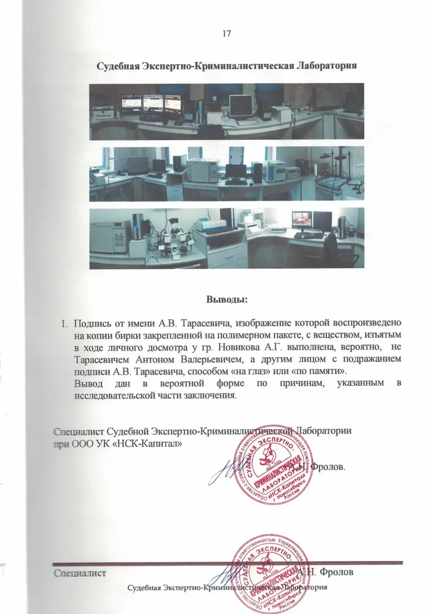 К примеру, бирка, которой опечатан пакет с растительным веществом, изъятым у Алексея Новикова – совсем не та, что прикреплена к пакету, отданному следователями эксперту. На первой стояли подписи старшего ночной смены Алфимова и вышеупомянутого Абдрахманова, на второй — старшего дневной смены Тарасевича. Как следует из показаний всех опрошенных свидетелей–коллег Тарасевича, он покинул КПП в 19.30, а видео, снятое Абдрахмановым на служебную камеру, показывает еще более поздний час — между 21 и 22.00.