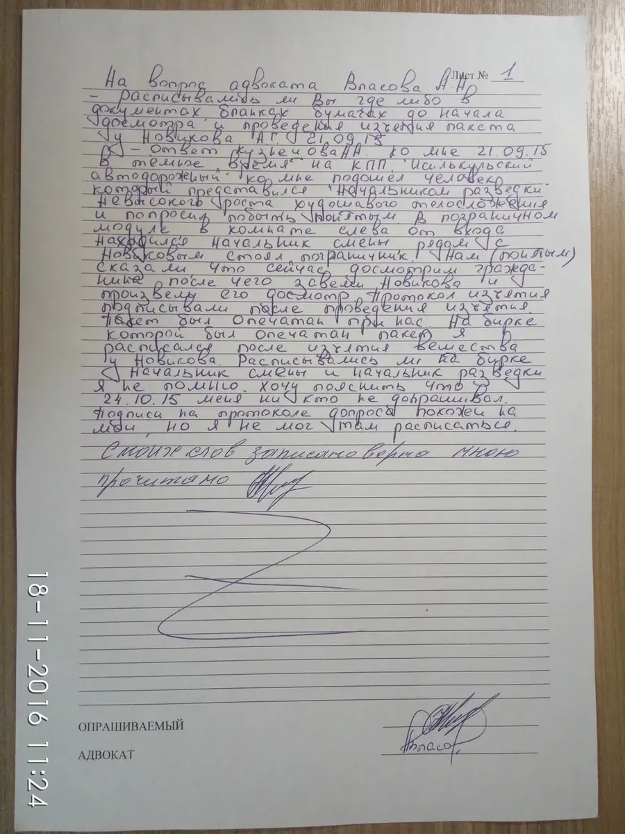 Поддельны, как выяснилось, и подписи на протоколе допроса одного из понятых — Кузнецова. Он письменно подтвердил Андрею Власову, что никто его не допрашивал, и «С моих слов записано верно» писал не он. Про второго понятного сказать нельзя ничего, поскольку он не смог встретиться с адвокатом и не приехал на судебный процесс.