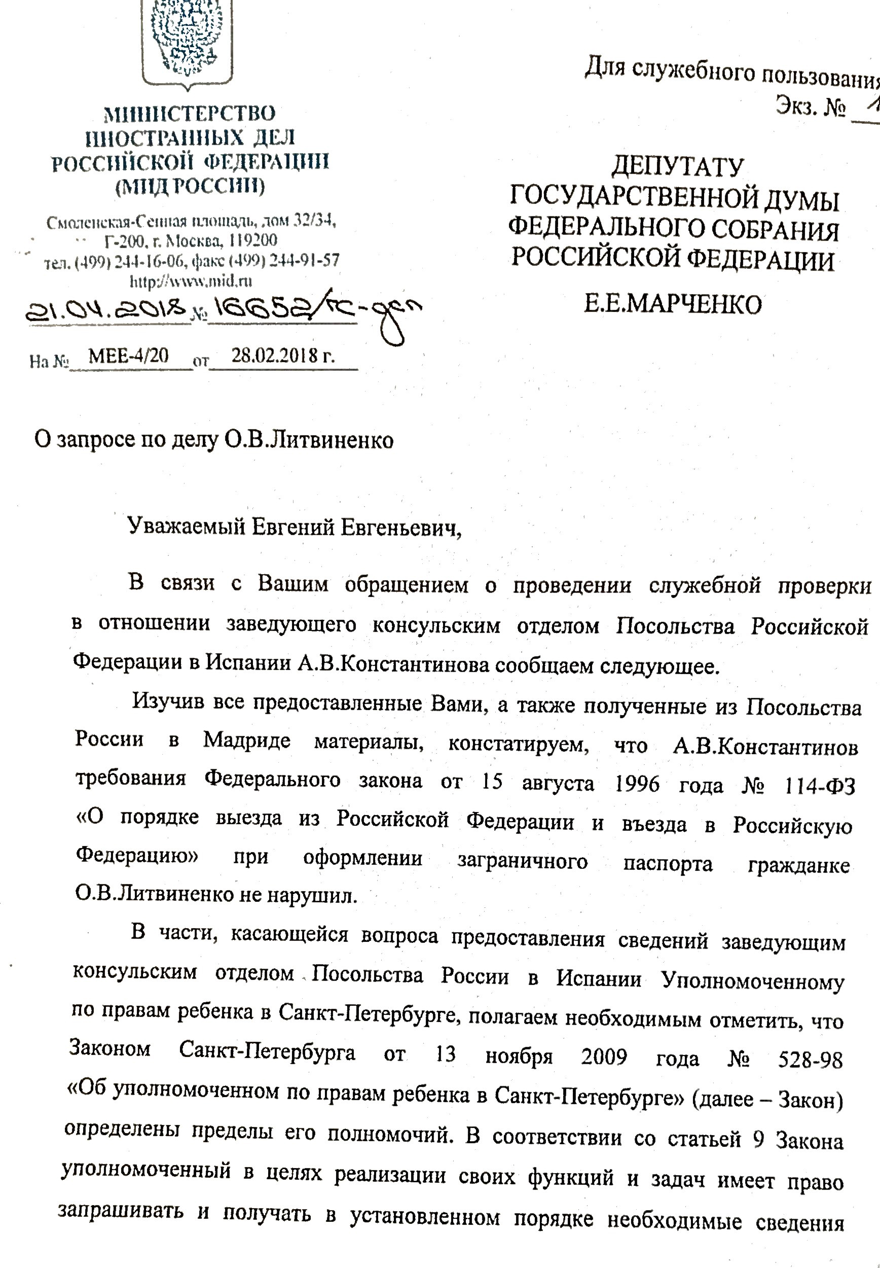 В дальнейшем я узнала, что депутат Госдумы РФ Е. Марченко, видимо, до сих пор переживающий мой отказ стать его невестой, сделал депутатский запрос в МИД РФ с просьбой проинформировать его, какие меры наказательного характера были приняты в отношении сотрудников посольства РФ в Испании, которые выдали мне паспорт. В ответ на этот нелепый запрос был получен ответ из МИД РФ, что никаких нарушений при выдаче мне нового паспорта сотрудниками посольства допущено не было, личность моя была идентифицирована в полном соответствии с установленным порядком, документы проверены, и паспорт был выдан на законных основаниях. Для Вашего сведения копию запроса депутата Марченко, который, видимо, никаких более важных государственных дел в вашей Государственной думе для себя найти не может, и копию ответа этому самому депутату из МИД РФ прилагаю.