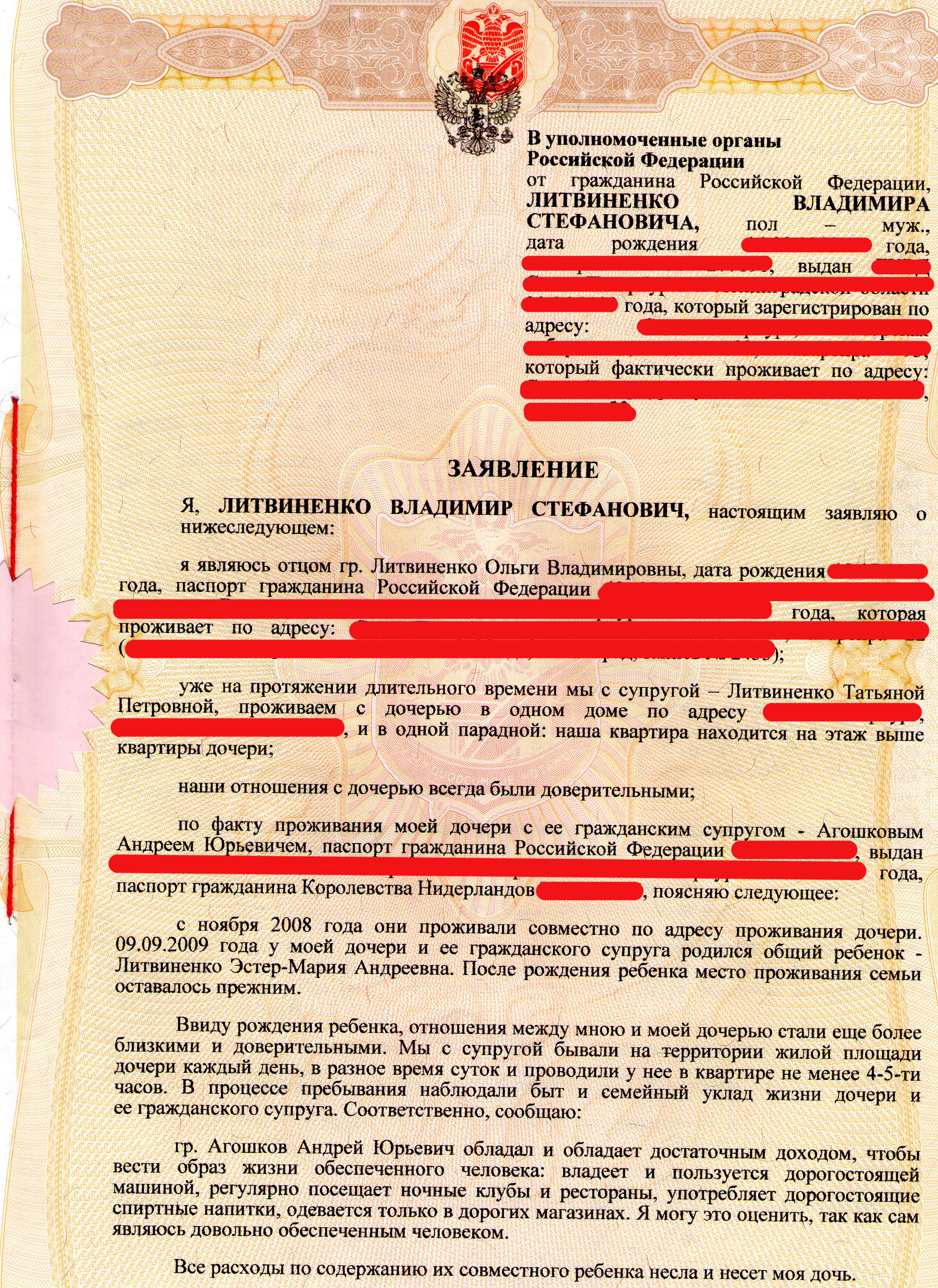 Я решила действовать через суд. Первое заседание в Василеостровском федеральном суде было мною выиграно без особого вмешательства каких-либо адвокатов с моей стороны. Папенька же мой, естественно, до посещения столь позорного для него суда не опустится и прислал туда своего юриста, оказавшуюся настолько некомпетентной, что она не смогла хоть как-то возразить на мои законные требования. Конечно же, папенька так оставить дело не смог, подключил свой финансово-административный ресурс, и следующие заседания в апелляционной инстанции уже были проведены так, что я не могла что-либо сказать вообще. Противореча, как обычно, самому себе, ректор Литвиненко пытался "доказать" в суде, что я якобы не очень заботливая мать. Но перед этим тот же самый мой папенька распинался о том, как я забочусь о ребенке и как я одна его обеспечиваю и содержу. (Копия его нотариально заверенных показаний папеньки также прилагается для Вашего, гражданин президент, внимания.)