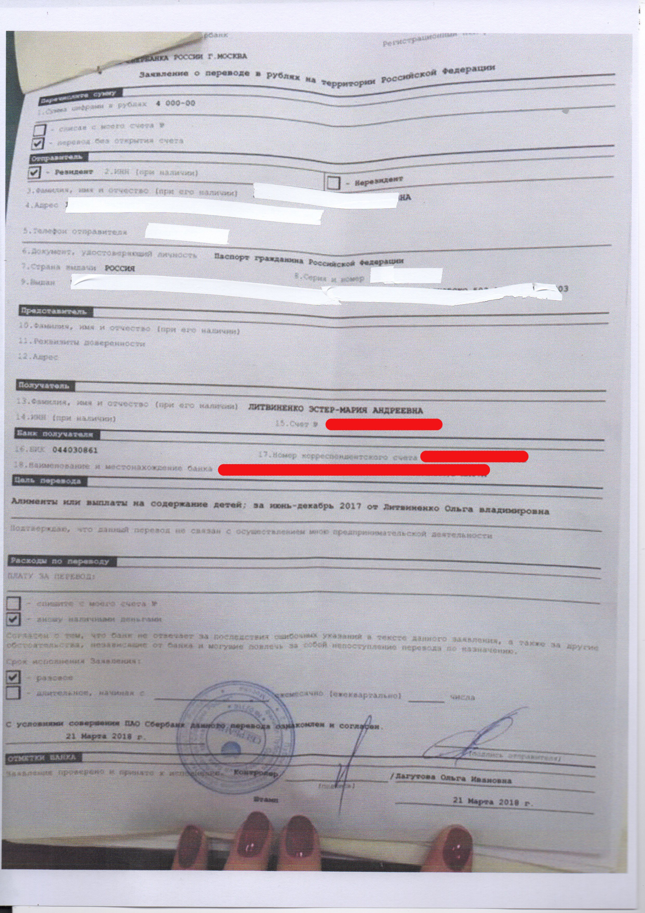 Я, как законопослушный гражданин моей страны, выполняю решение суда, хотя и считаю его заведомо неправосудным и не имею возможности его обжаловать, потому что суды на нашей с Вами, гражданин президент, родине стали за последние 18 лет практически полностью коррумпированы зверьками с миллиардами долларов в карманах. То есть в руководимом Вами, гражданин президент, государстве под названием Россия вполне законно и главное нормально взимать алименты с человека, находящегося в статусе похищенного в соответствии с незакрытым уголовным делом. То есть вместо того, чтобы искать меня и спасать от якобы каких-то похитителей, правоохранительная система руководимого Вами государства занимается взысканием с меня алиментов на содержание моего ребенка, которого у меня на самом деле и похитили и удерживали незаконно на той самой даче, где похититель моей дочери, мой отец и Ваш научный руководитель, изготавливал для Вас диссертацию. Копия одной из квитанций об оплате мной алиментов прилагается.