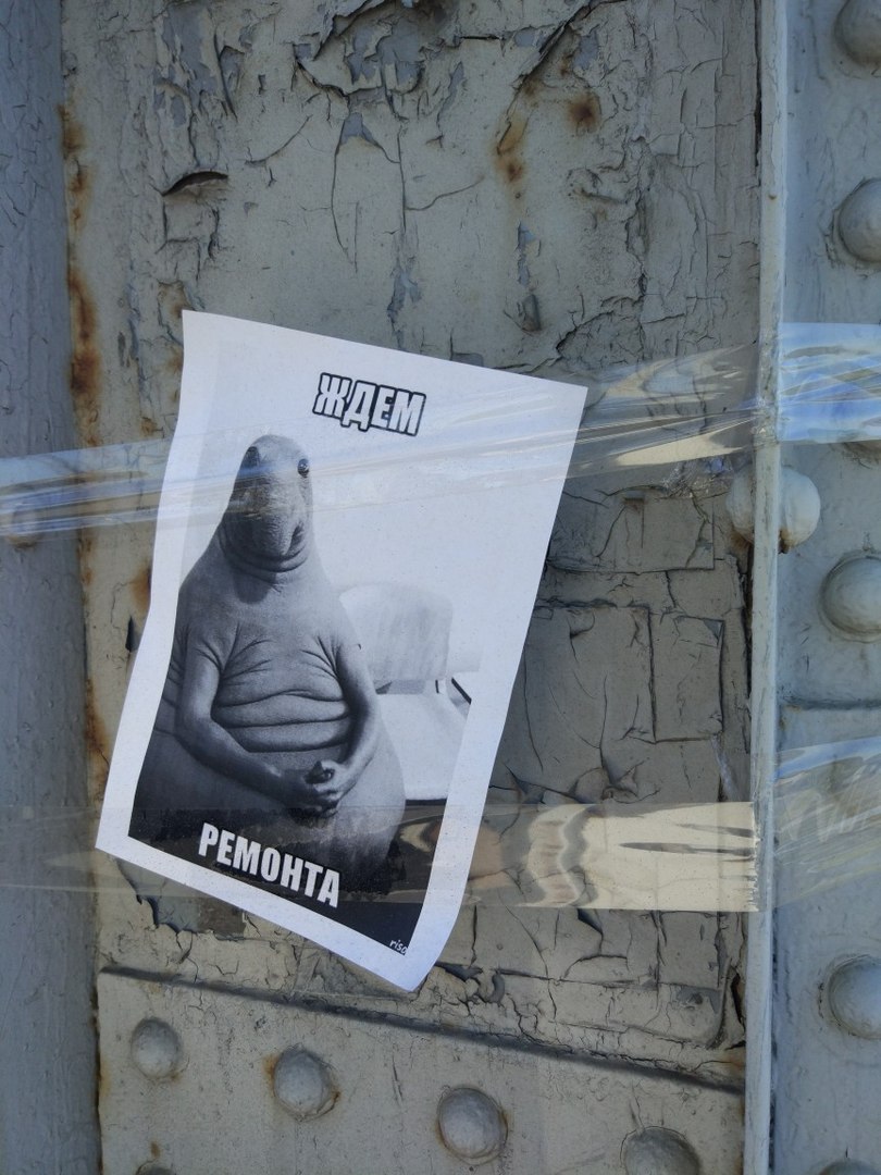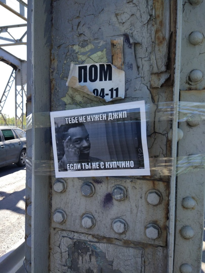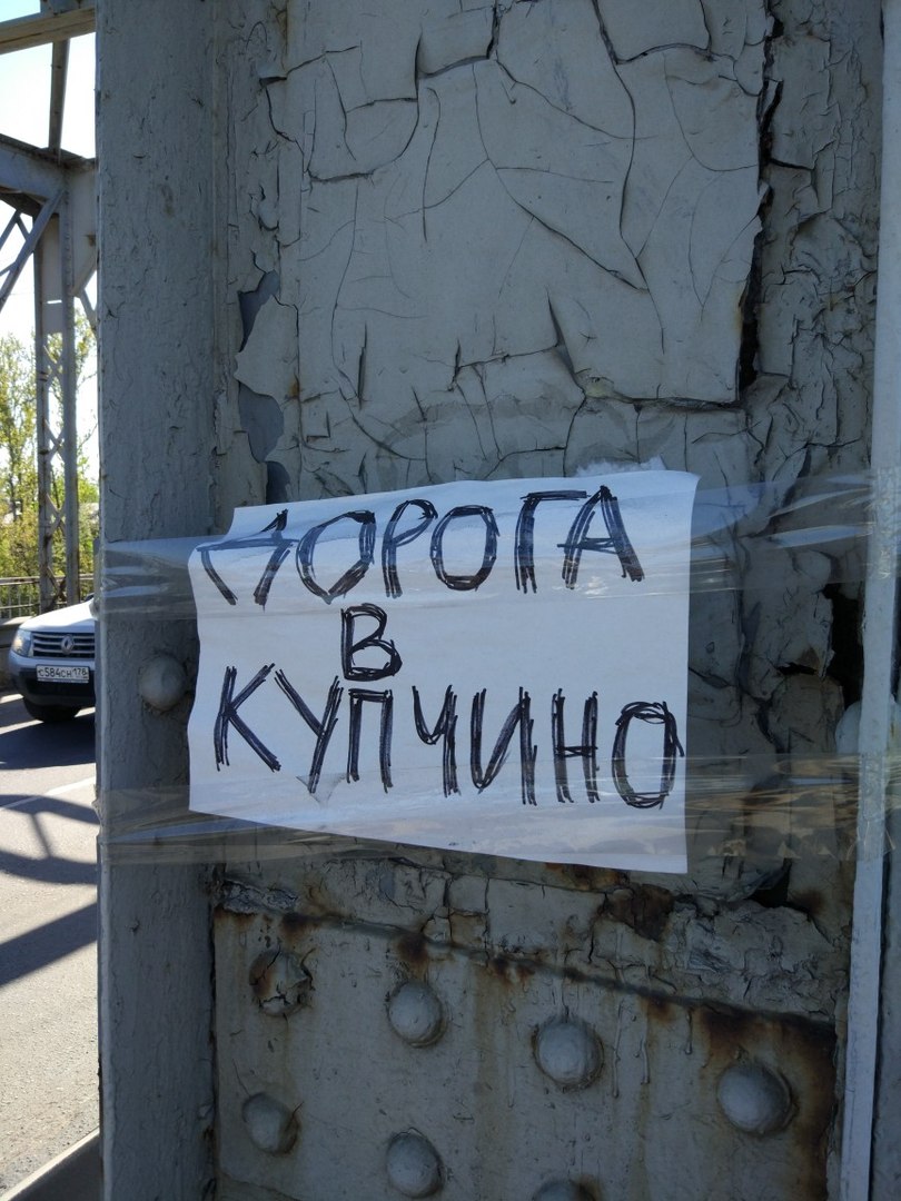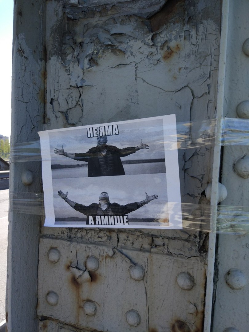 На опорах моста между улицами Цимбалина и Белы Куна расклеили плакаты с мемами о ямах, которыми покрыта переправа. Об этом «Бумаге» сообщают читатели.