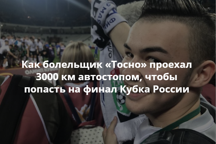 На Sports.ru рассказали историю Романа Тубянского, 18-летнего болельщика «Тосно», который автостопом проехал 3000 км от Петербурга от Волгограда, где проходил финал Кубка России между «Тосно» и курским «Авангардом».