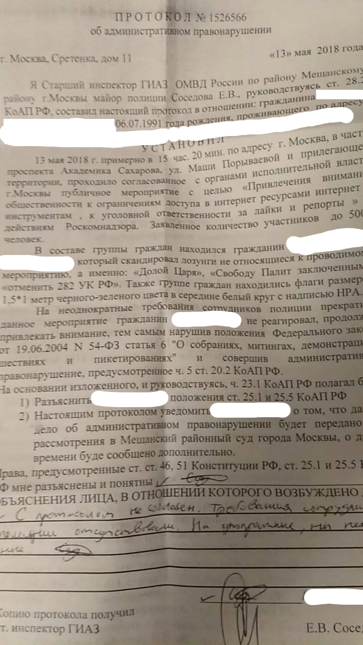 В распоряжении «Медиазоны» оказался протокол, составленный в отношении одного из задержанных. В нем сказано, что участник акции скандировал лозунги, не относящиеся к тематике проводимого мероприятиях. Среди них «Свободу Палит заключенным» и «отменить 282 УК РФ» (орфография сохранена).