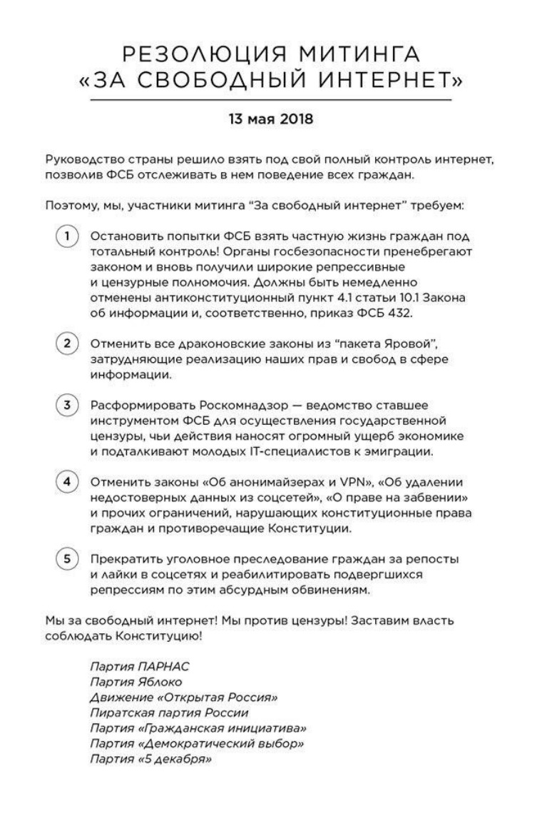 После митинга участники приняли резолюцию, в которой были сформулированы требования к силовикам о прекращении тотального контроля над частной жизнью граждан. От властей потребовали отменить «пакет Яровой» и других сомнительных законов, регулирующих интернет. В резолюцию также было вписано требование прекратить преследование граждан за публикации в соцсетях, а Роскомнадзор – расформировать.