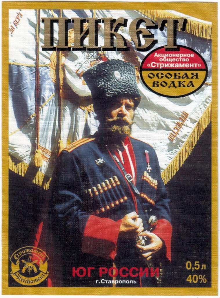 Этикетка водки «Пикет» с Серегой в качестве моделиФото: из личного архива автора Сначала тыкались по знакомым, никому КамАЗы водки были не нужны. Пытались через продуктовые магазины — без результата. Продавцы из художников, как правило, так себе. А один раз разговорились с владельцами магазина одежды по соседству, и те загорелись. Это были армяне, у них было много друзей армян, и они сказали: «Все будет, не беспокойтесь, друзья». Так у «Петрова» появилась своя крыша.