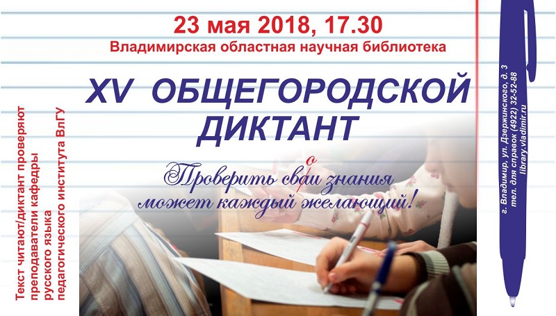 23 мая в 17:30 во Владимирской областной научной библиотеке пройдёт Общегородской диктант. Эта акция приурочена к Дню славянской письменности и культуры и проводится в рамках культурно-просветительского проекта «Год русского зарубежья». Поэтому в этом году тексты для диктантов будут взяты из произведений писателей-эмигрантов.