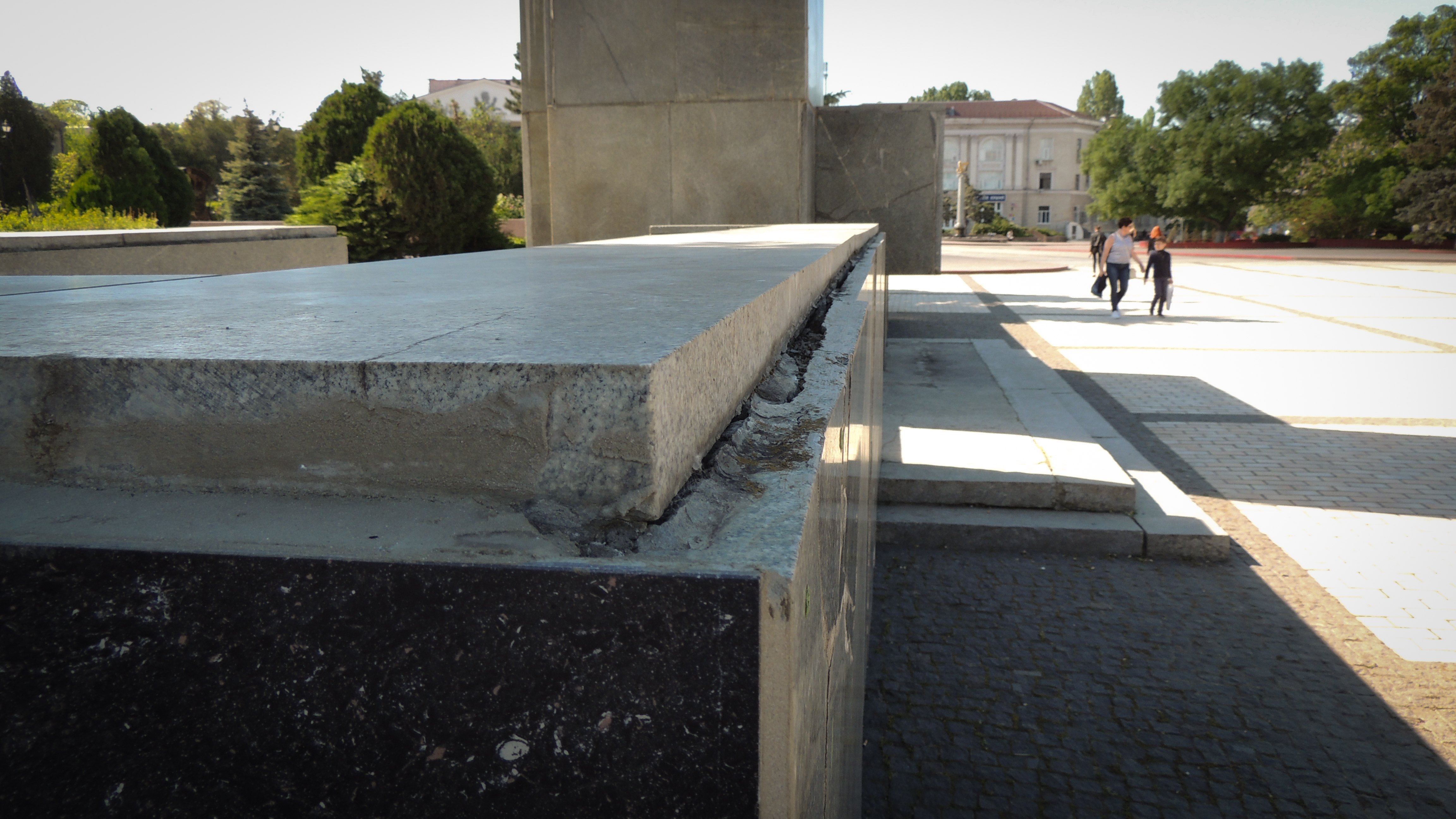 Как сообщает корреспондент Крым.Реалии, облицовочные плиты отходят от основания памятника. В некоторых местах на трибуне, оборудованной на памятнике Ленину, облицовочные плиты разошлись и рискуют обвалиться.