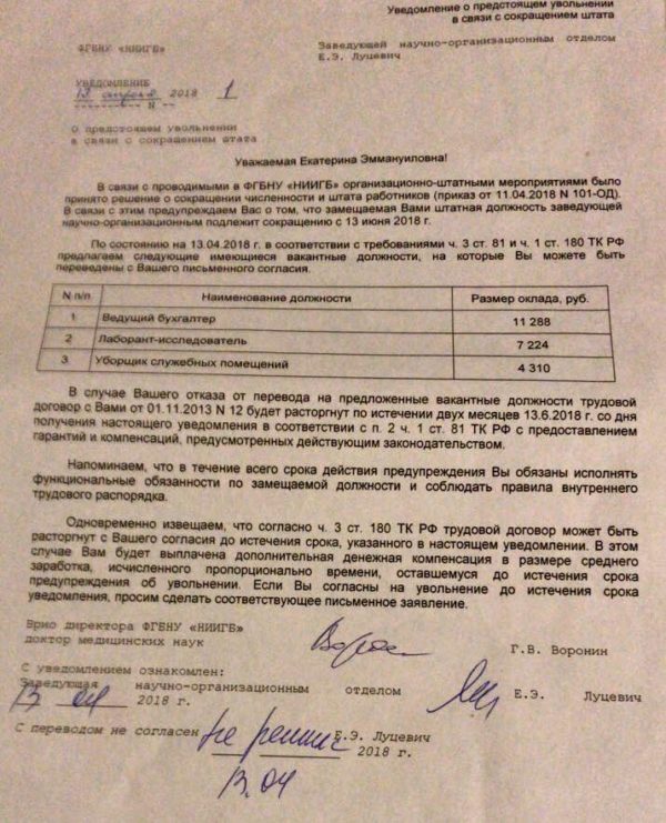 УведомлениеФото: Facebook Анастасии Васильевой По словам Васильевой, речь идет об уведомлении, которое поясняет, что сокращение проходит в рамках «организационно-штатных мероприятий». Научным сотрудникам предлагают перейти на следующие вакантные должности: ведущий бухгалтер с окладом 11 288 рублей, лаборант-исследователь с окладом 7224 рубля и уборщик служебных помещений с окладом в 4310 рублей. Причем в документе руководство ссылается на ч. 3 ст. 81 Трудового кодекс РФ, которая означает увольнение в связи «с несоответствием работника занимаемой должности или выполняемой работе вследствие недостаточной квалификации либо по состоянию здоровья, препятствующему продолжению работы».