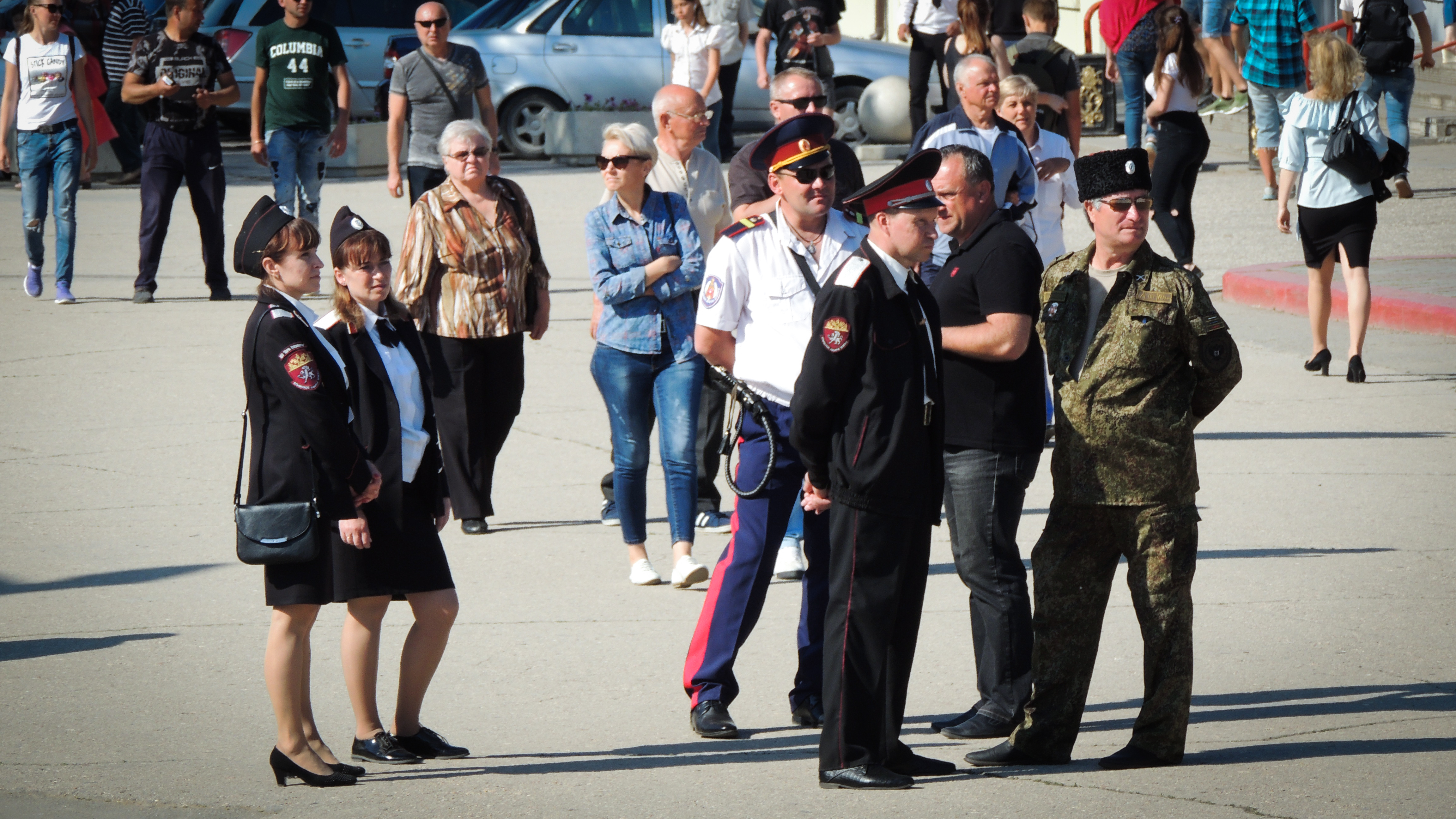 Само место проведения и прилегающую площадь огородили железным забором, пройти внутрь можно только через рамки металлодетектора. При этом казаки патрулировали площадь вместе с представителями российской полиции и Росгвардии.