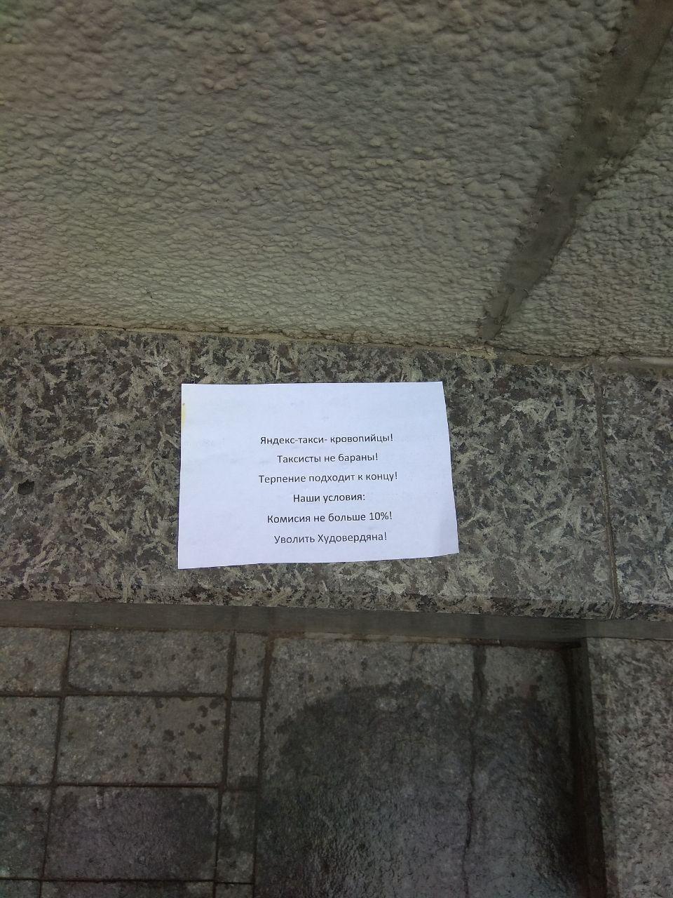 По информации телеграм-канала, вокруг здания также разбросаны листовки с требованием сделать комиссию от суммы заказа водителям «Яндекс. Такси» «не больше 10%» и уволить генерального директора сервиса Тиграна Худавердяна.