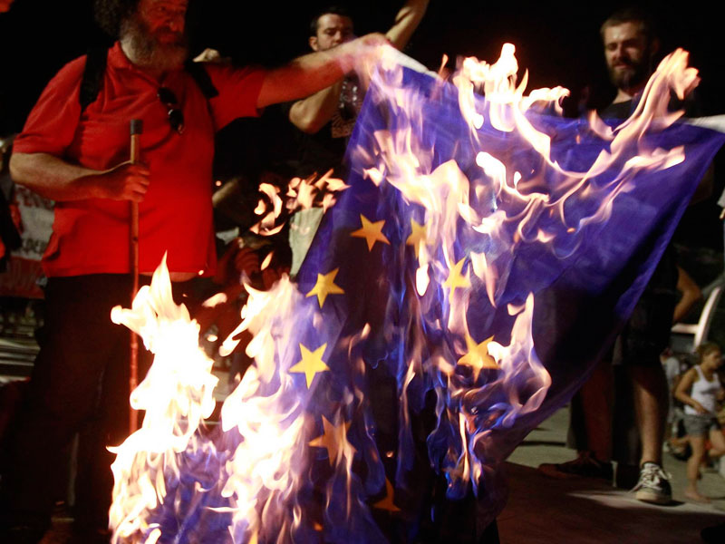 Протестующие сжигают флаг ЕС / flickr.com Но даже в случае, если компромисс всё же сорвется, результат мартовских выборов в Италии, где победил тандем противников истеблишмента и ультраправой партии, может оказать разрушительное воздействие на политику ЕС. В 2016 г. решение Британии выйти из ЕС оказала на евроэлиту освежающее воздействие: она осознала, что в системе необходимо что-то менять. События в Италии могут оказать парализующее воздействие. Теоретически они, конечно, могут, наоборот, сплотить евросилы в стремлении к переменам, но это маловероятно.