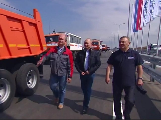 Владимир Путин проверил готовность Единого центра управления дорожным движением на Крымском мосту, а также эксплуатационных служб. Затем глава государства проехал по мосту за рулем КамАЗа, сказав «Поехали».