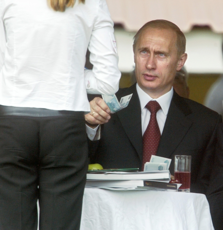 Владимир Путин делает денежную ставку на проведении первых "Скачек на приз Президента России" на Центральном Московском ипподроме. Фото: Илья Питалев / Коммерсантъ