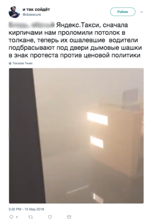 15 мая неизвестные бросили дымовую шашку в офис компании «Яндекс.Такси» около станции метро «Павелецкая» в Москве. Фотографии с акции появились в профиле пользователя Инстаграма Артёма Набатова, в сервисе подтвердили TJ факт происшествия.