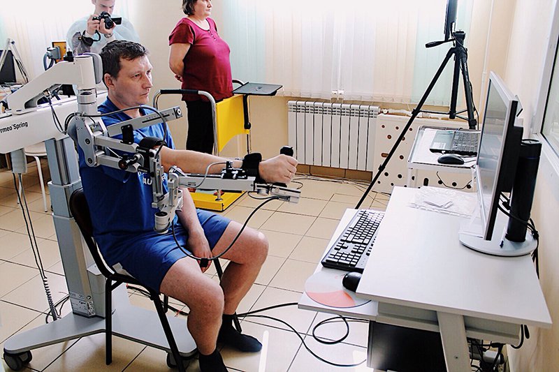 Мужчина с трудом поднимает тяжёлую гашетку, прикреплённую к тренажёру, на экране понемногу складывается жёлто-синий пазл. По словам врача, больным нужна игровая форма реабилитации: «Согласитесь, скучно делать упражнение с обычной палочкой. Люди ждут чего-то нового. И нам есть чем их удивить, например роботизированным протезом. Этот тренажёр способствует восстановлению движения в суставах руки. Пациенту предлагается выполнить определённое задание, которое задействует повреждённые группы мышц. Игровой момент увлекает и мотивирует ещё и потому, что в конце занятия можно увидеть результат своих усилий, каждый стремится работать на пределе своих возможностей».