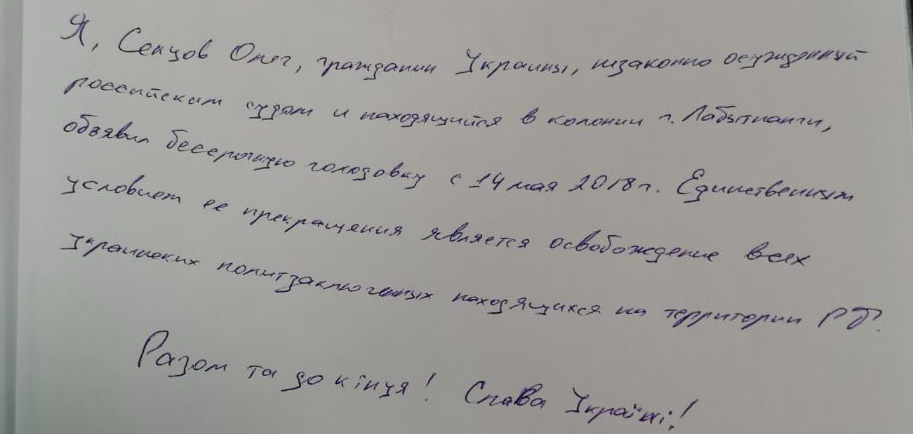«Я, Сенцов Олег, гражданин Украины, незаконно осужденный российским судом и находящийся в колонии города Лабытнанги, объявляю бессрочную голодовку с 14 мая 2018 года. Единственным условием ее прекращения является освобождение всех украинских политзаключенных, находящихся на территории РФ», — написал Сенцов в записке, которую он передал через адвоката.