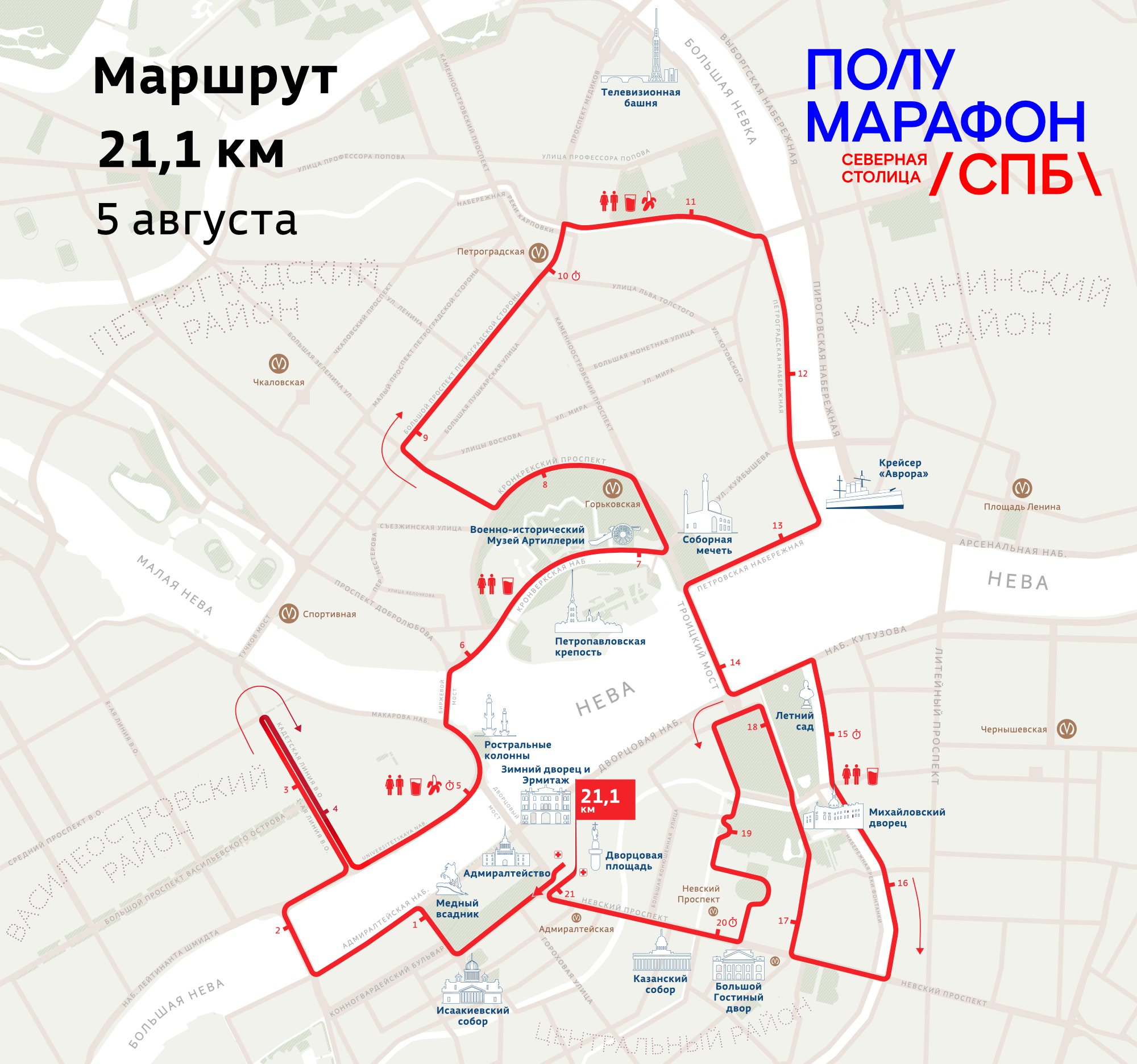 Спортсменам предложат две дистанции на выбор: 21,1 км и 10 км. Оба маршрута стартуют на Дворцовой площади. Участники смогут пробежать по Невскому проспекту, Троицкому мосту и мимо Летнего сада.