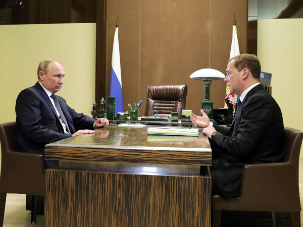 Владимир Путин на рабочей встрече с Председателем Правительства Дмитрием Медведевым kremlin.ru Во вторник вечером Дмитрий Медведев все-таки представил Владимиру Путину проект указа о структуре нового правительства — документ сразу же был подписан. Такая задержка была, судя по всему, связана с тем, что Владимир Путин до того участвовал в церемонии открытия Крымского моста. Собственно даже сама встреча прошла не в подмосковной резиденции главы государства, а в Сочи.