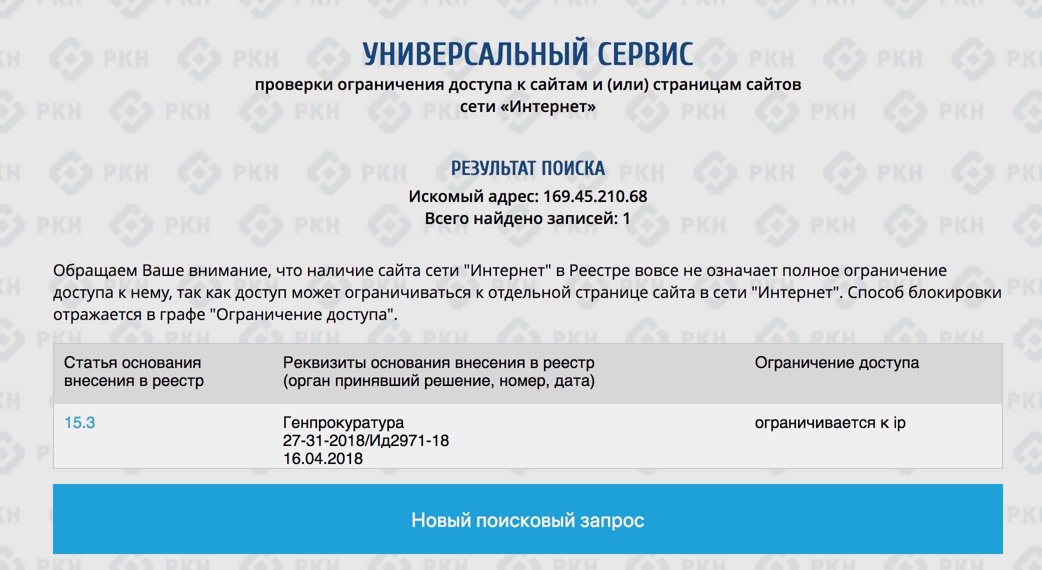 «Медуза» проверила несколько IP-адресов WhatsApp, попавших в выгрузку, на сайте Роскомнадзора. Там указано, что доступ к ним ограничивается по решению Генпрокуратуры 31.27.2018/Ид2971-18. По этому же решению в реестр вносились миллионы IP-адресов популярных хостинг-провайдеров, когда Роскомнадзор пытался заблокировать мессенджер Telegram.