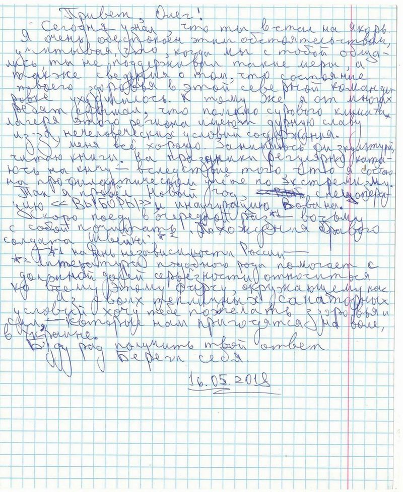 Письмо Александра Кольченко Олегу Сенцову, 16.05.2018