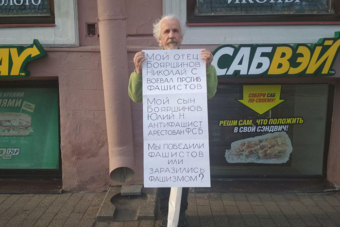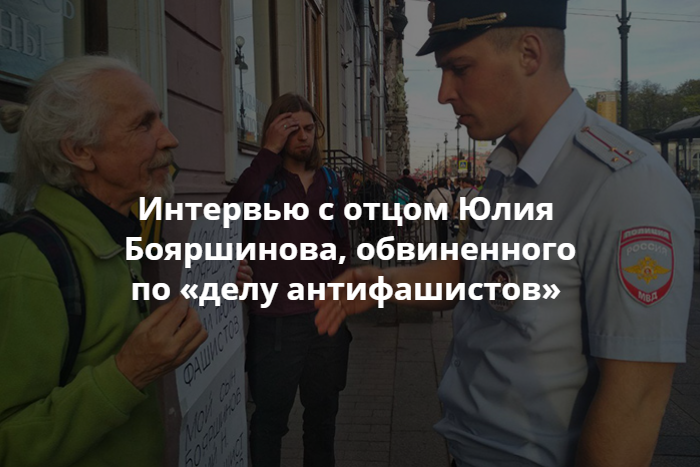 11 мая отец Юлия Николай Бояршинов вышел на Невский проспект с пикетом против задержания сына. Николай рассказал «Бумаге», что думает о «деле антифашистов», как они с женой живут без содержавшего их сына и поддерживают ли Юлия друзья.