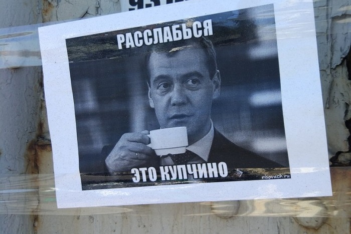 На опорах покрытого ямами моста на юге Петербурга расклеили мемы про Медведева и ремонт дороги