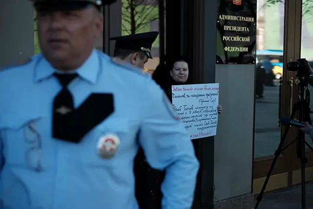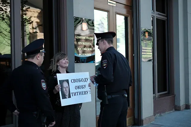 В Москве у здания администрации президента прошла серия одиночных пикетов в поддержку главы грозненского отделения «Мемориала» Оюба Титиева, обвиняемого в хранении наркотиков в крупном размере (ч. 2 ст. 228 УК).