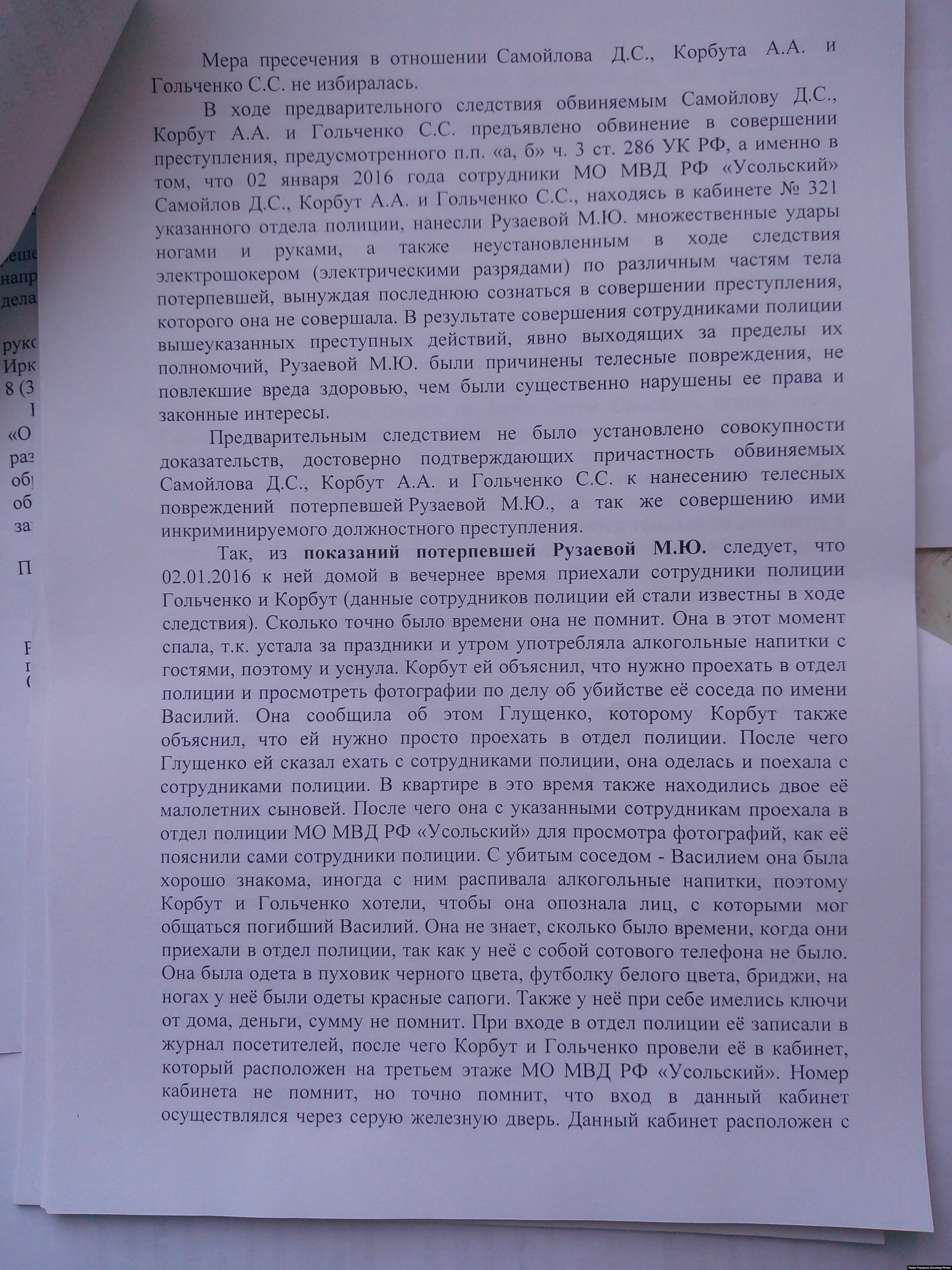 Той же ночью сотрудники травмпункта сообщили в отдел полиции о совершенном там преступлении, после чего к Рузаевым домой приехал участковый. Марина подала заявление в полицию, а утром Павел отвез ее заявление и в Следственный комитет. Затем Рузаева обратилась к иркутским медикам, которые зафиксировали у женщины ушибы мягких тканей головы, шеи, грудной клетки, голени и предплечья, бедер, а также несколько электроожогов на теле.