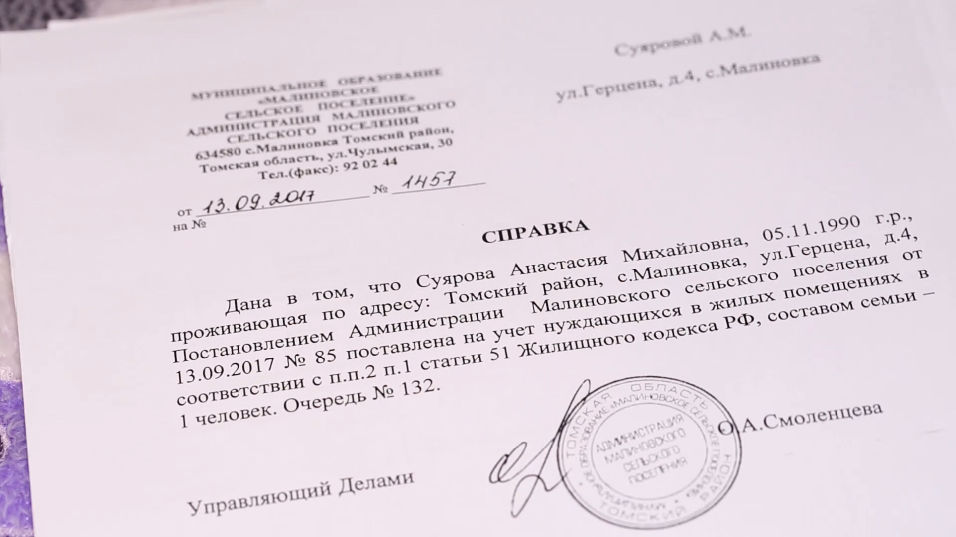 Но городские власти Томска в очередь Анастасию не ставят из-за того, что она прописана в селе, и, по их мнению, заботиться о ней тоже должны власти села.
