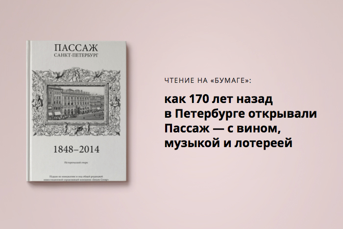22 мая 1848 года в Санкт-Петербурге на Невском проспекте открылся Пассаж. По этому поводу «Бумага» публикует отрывок из книги «Пассаж. Санкт-Петербург. 1848–2014», выпущенной к 170-летию торговой галереи.