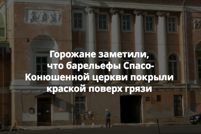 Днем 22 мая очевидцы заметили, что барельефы на здании Спасо-Конюшенной церкви покрывают белой краской из распылителя. Кроме того, барельефы были грязные, рассказали горожане.
