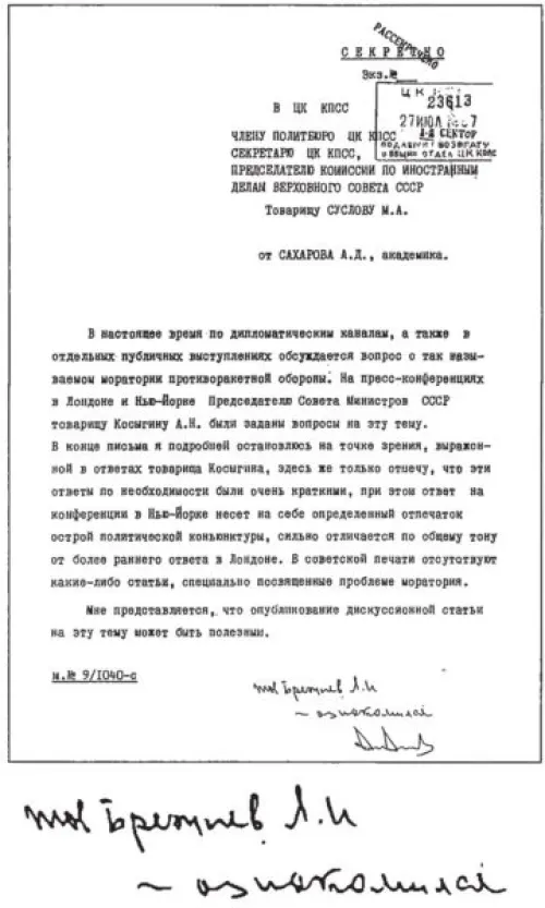 В связи с этим отказом Сахаров подготовил свое обоснование необходимости моратория и 21 июля 1967 года служебно-секретной почтой направил его в Политбюро (это послание рассекретили в середине 1990-х). Сахаров был лишь заместителем Харитона, но он был «отцом» советской водородной бомбы, а смелостью и ответственностью превосходил своих коллег. Обстоятельное 9-страничное письмо он начал так: «В настоящее время по дипломатическим каналам, а также в отдельных публичных выступлениях обсуждается вопрос о так называемом моратории противоракетной обороны. На пресс-конференциях в Лондоне и Нью-Йорке Председателю Совета Министров СССР товарищу Косыгину А. Н. были заданы вопросы на эту тему…»