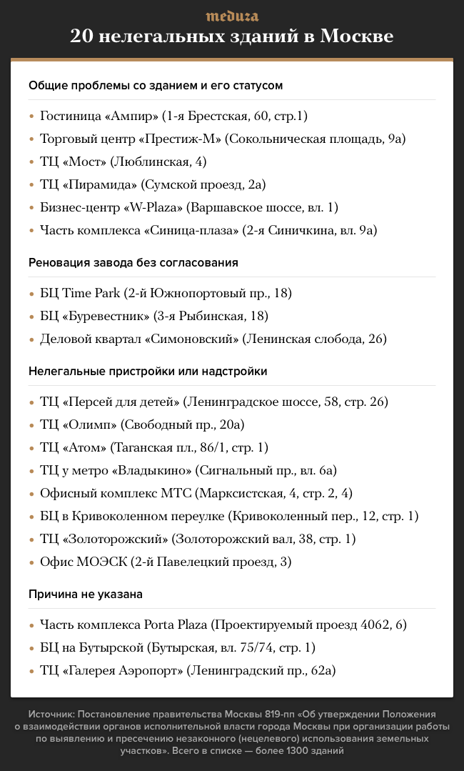 В списке, составленном инспекцией, — почти 1360 зданий. У них есть документы на собственность, но они были построены или перестроены самовольно, без получения необходимых разрешений и согласований или с нарушениями. Одно из часто встречающихся нарушений — та же проблема, что была у «Зимней вишни». На такое нарушение владельцы могут идти из-за экономии: ставка земельного налога для промышленного здания в несколько раз ниже, чем для торгового объекта. Также «промышленный» статус позволяет экономить на мерах противопожарной безопасности: например, в торговых центрах нельзя использовать слишком горючие (и более дешевые) стройматериалы — линолеум и древесно-стружечные плиты для отделки стен.