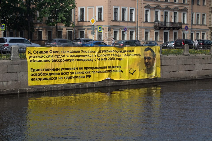 Активисты петербургского отделения «Открытой России» повесили на набережной канала Грибоедова баннер в поддержку украинского режиссера Олега Сенцова, приговоренного к 20 годам колонии строгого режима по обвинению в терроризме.