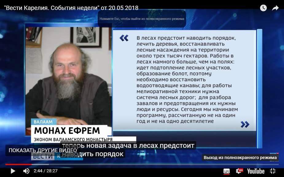 И когда теперь Панкратий Жердев и его послушник эконом Мухин вещают про то, как они «берегут лес» и планируют программу восстановления лесов «на десятилетия», становится понятным их замысел, а именно: обеспечить себя дармовым государственным финансированием. Рекламный ролик про «трудящегося монаха» на лесоповале, с послушниками-слугами, ролик, который крутят за государственный счет на государственном телеканале! Все это — для очередного получения Валаамским монастырем денежных средств из госбюджета!
