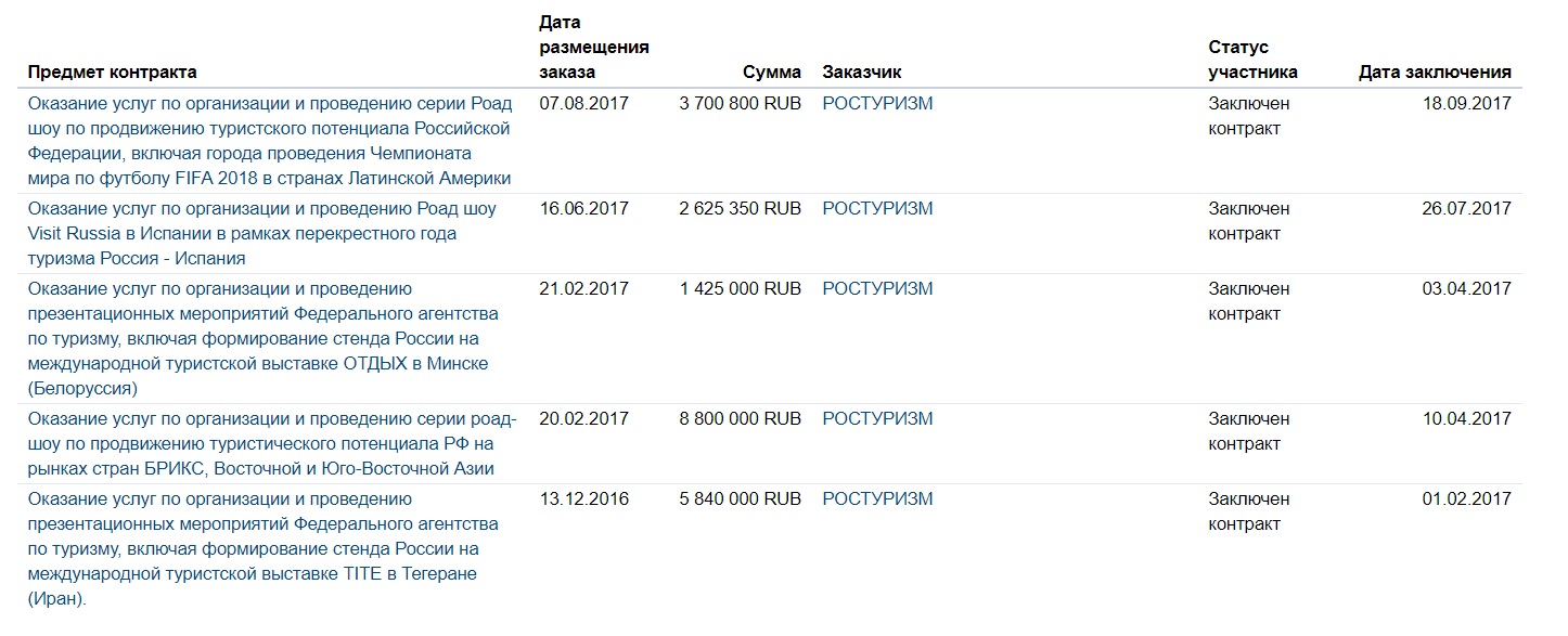 - Мы проверили эту информацию. По данным «СПАРК-Интерфакс», в 2016-2017 годах «Свой туристический сервис» получил 5 контрактов Ростуризма на проведение разных выставок и презентацияй за рубежом.