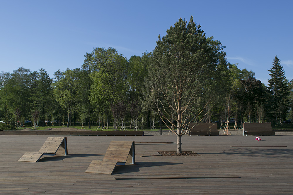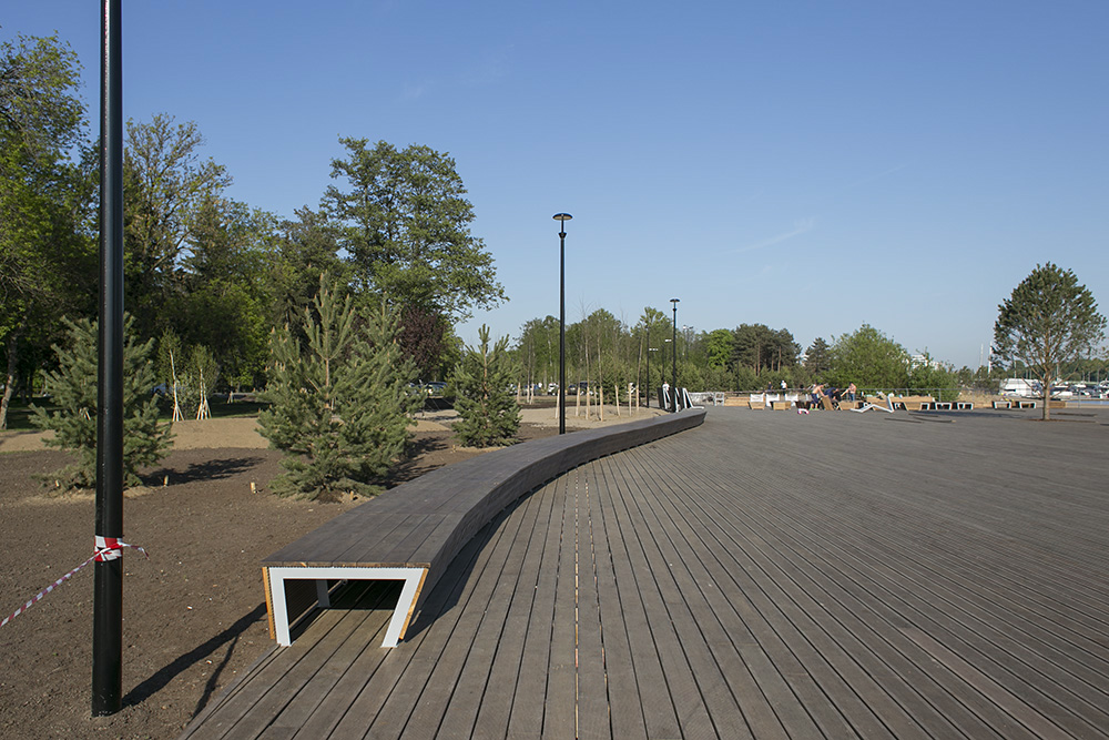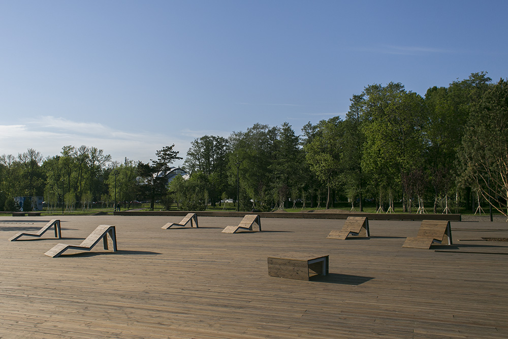 Деревянный настил сделан из лиственницы, доски обрабатывали немецким масловоском и прикрепили на скрытый крепеж под площадкой. «В городе нет подобной площадки, которая и была бы сделана из таких высококачественных материалов, и на которой есть уникальные малые формы, разработанные специально под нее», — говорит Исьянов. По его словам, проект выполнен в европейском стиле, но без типовых решений.