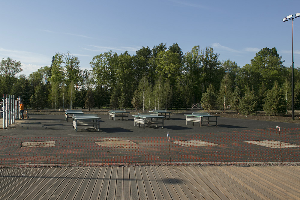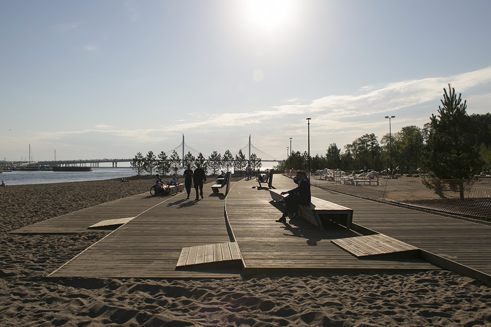 На Крестовском острове появилась зона отдыха: участок у Южной дороги с выходом к Финскому заливу покрыли деревянным настилом, установили скамейки и столы для настольного тенниса, вокруг высадили деревья.
