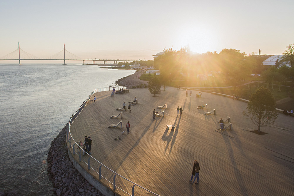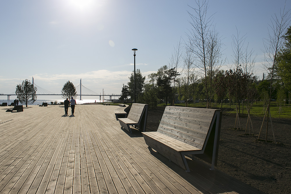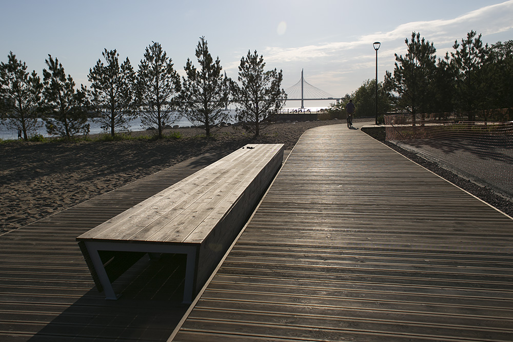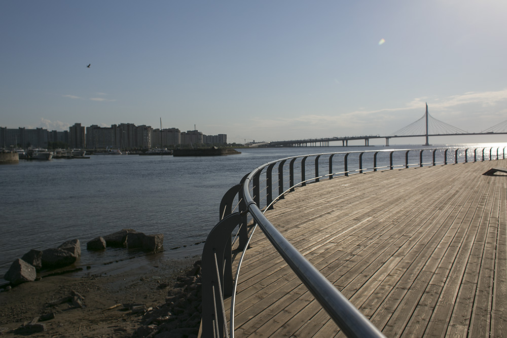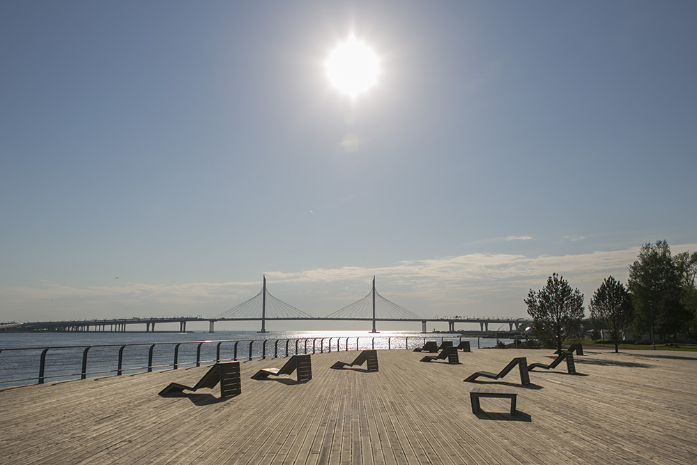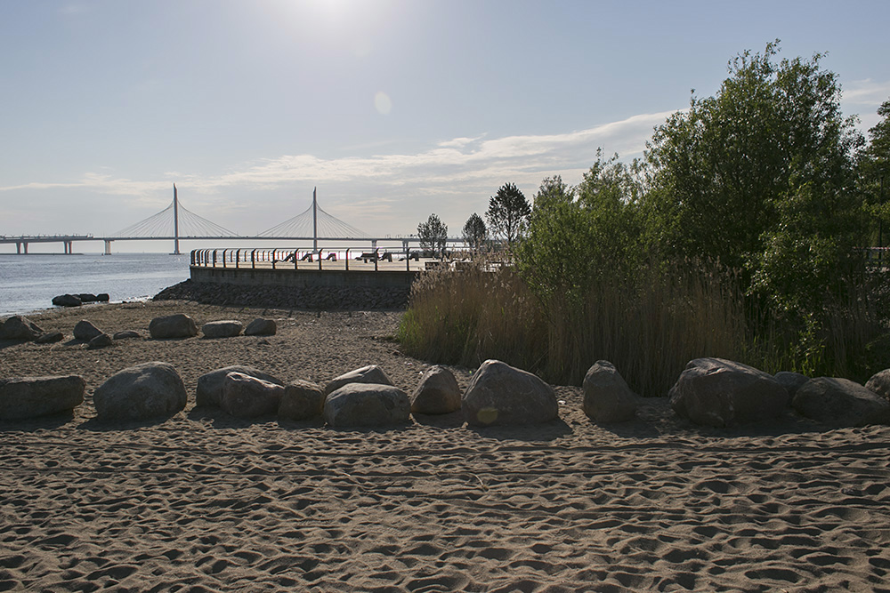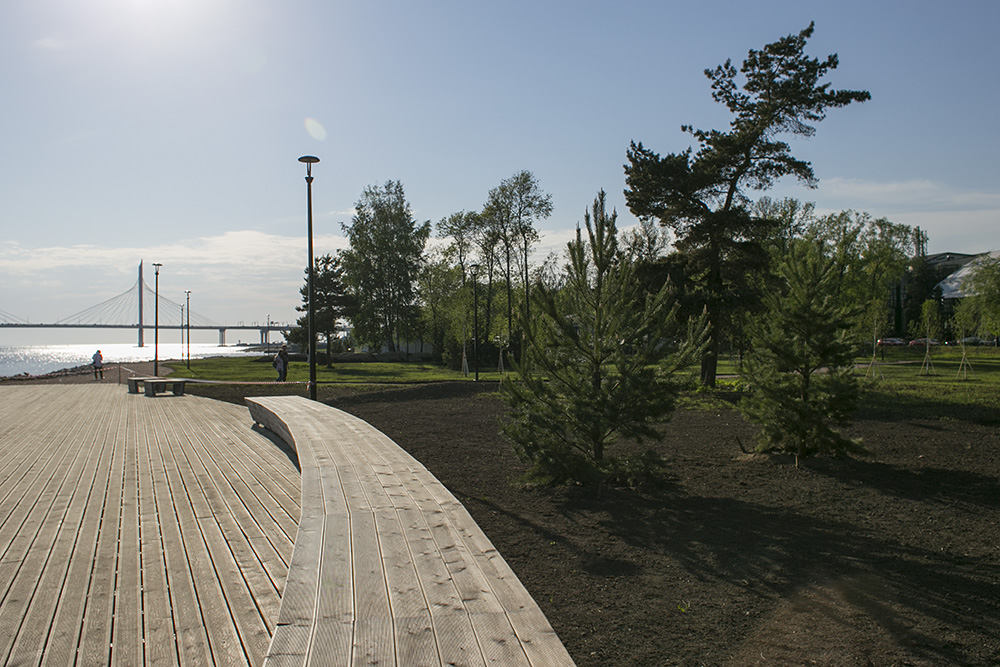 Завершающим элементом благоустройства стала зона отдыха со скамейками с видом на Финский залив и высаженными деревьями. Ее строила компания «А2 ТЭК». Генеральный директор компании Максим Исьянов рассказал «Бумаге», что с площадки должны были просматриваться и Финский залив, и ванты ЗСД.