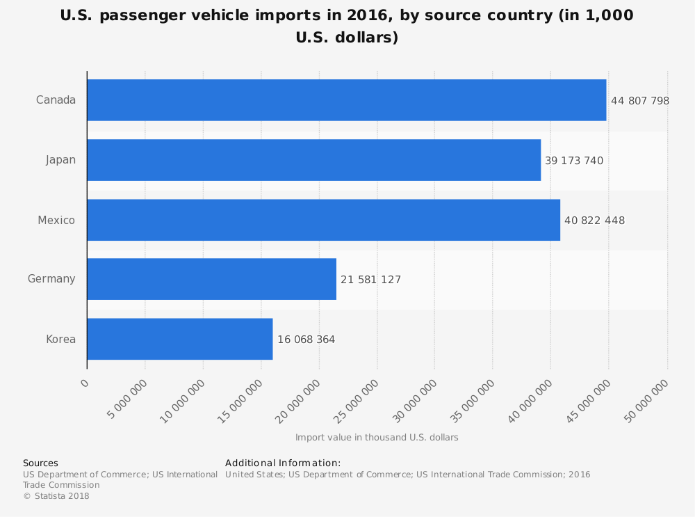 • В 2017 году в США было произведено 12 млн автомобилей, а 8,3 млн — импортировано. Общий лобъем импортав деньгах составил $192 млрд.