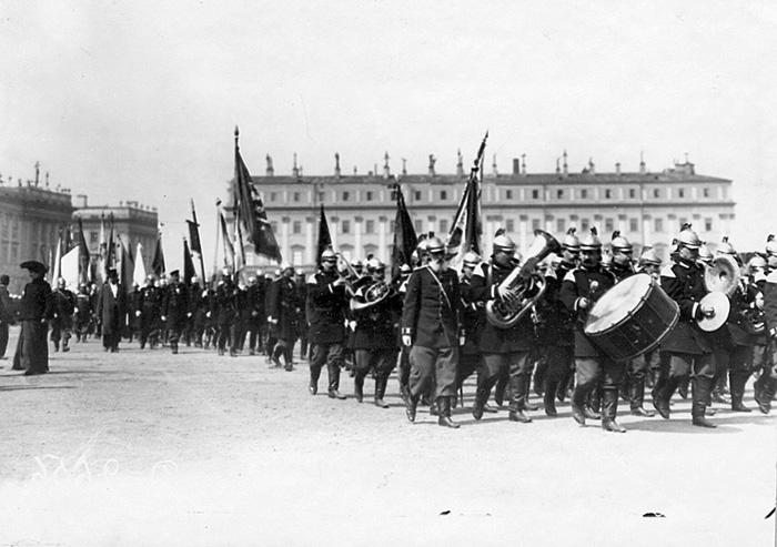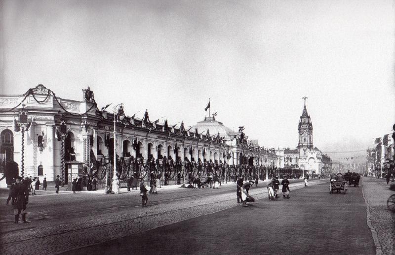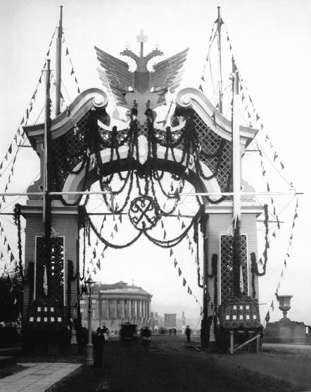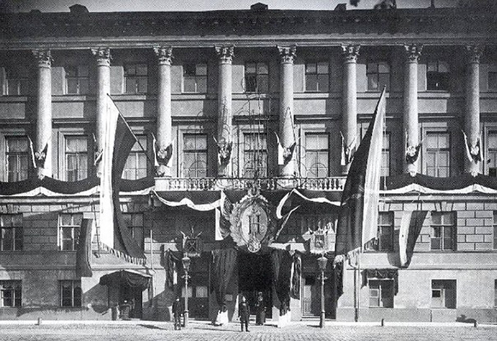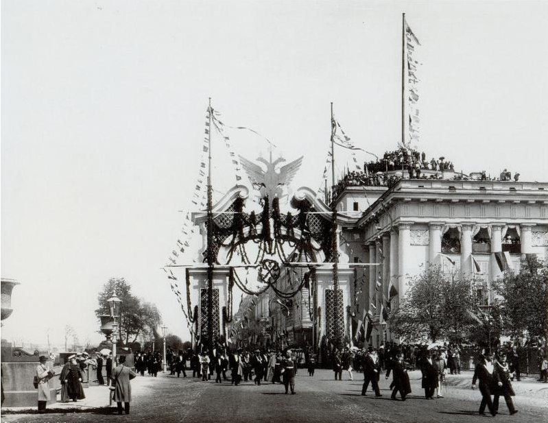 — Сегодня утром, написав несколько ярлыков, я пошел с папой и сестрой гулять по городу. Погода стояла чудесная. Весь город оделся флагами. Народ толпой валил по улицам. Балкончики покрылись полотном красного, синего и белого цвета. На иных виднеются статуи императоров Петра I и Николая II среди темной зелени карликовых пальм. На площадях, как, например, на Исаакиевской, стоят обелиски и колонны с орлами или штандартами. Вокруг них устроили сиденья из веток ели. Столбы украшены большими и маленькими флажками. Вход в Почтамтскую улицу украшен множеством флагов.