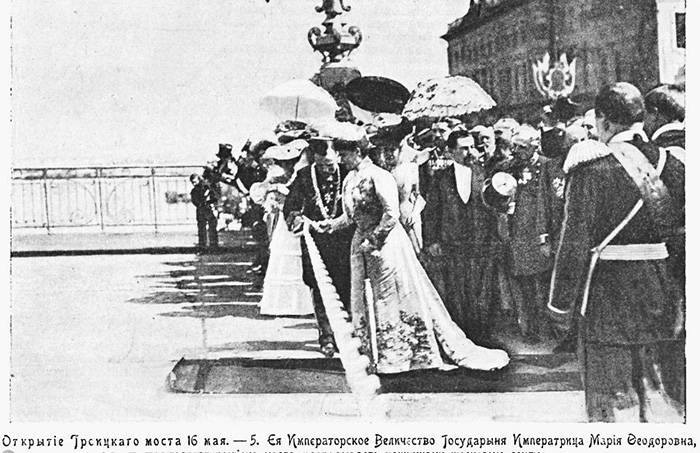 Потом Императрице Марии Федоровне поднесли на бархатной подушке электрический привод, и как только она надавила его пуговку, разводная часть моста стала медленно повертываться и соединила постоянный мост с берегом. Тогда Ее Величество ножницами перерезала пеструю ленту, загораживавшую мост, и все за иконой и духовенством направились пешком по великолепному новому мосту на правый берег.